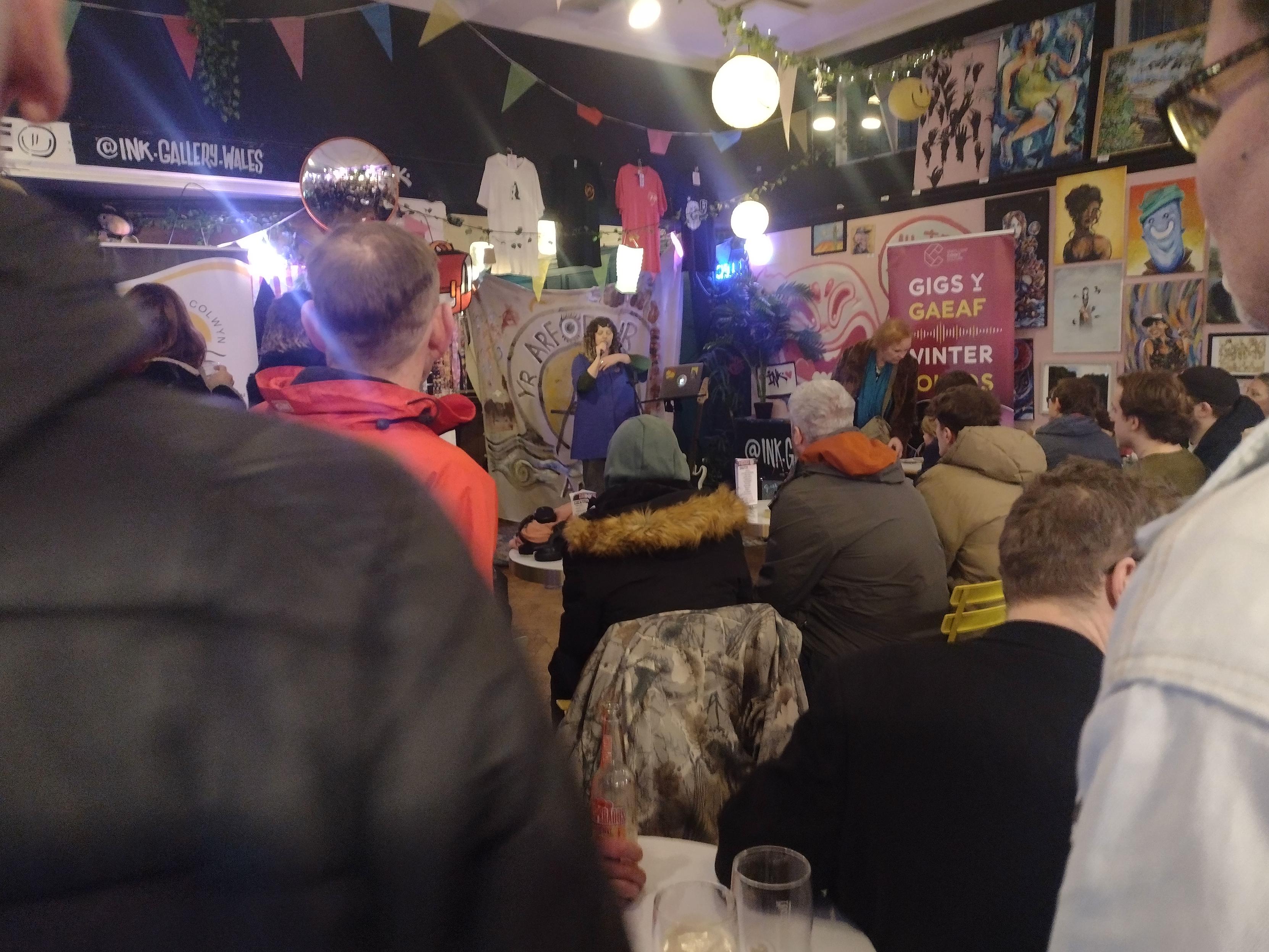 Solo artist in an intimate bar/gallery. Audience a mix of seated and standing.