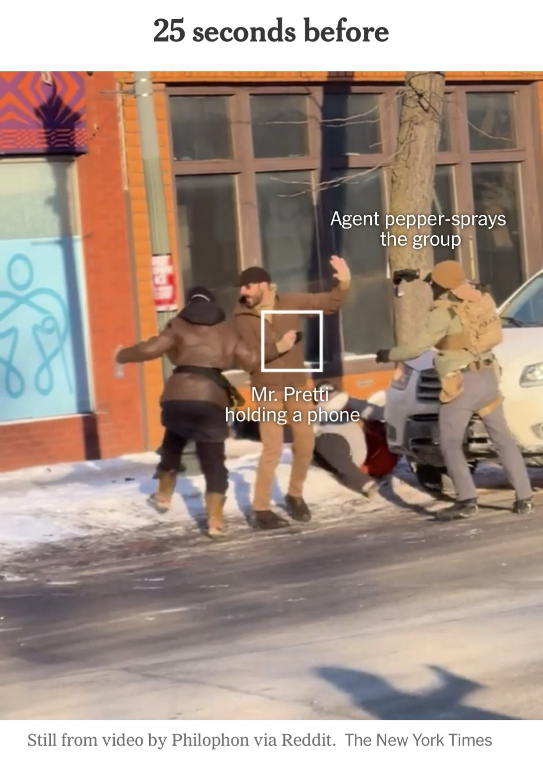 25 seconds before Agent pepper-sprays the group Mr. Pretti holding a phone