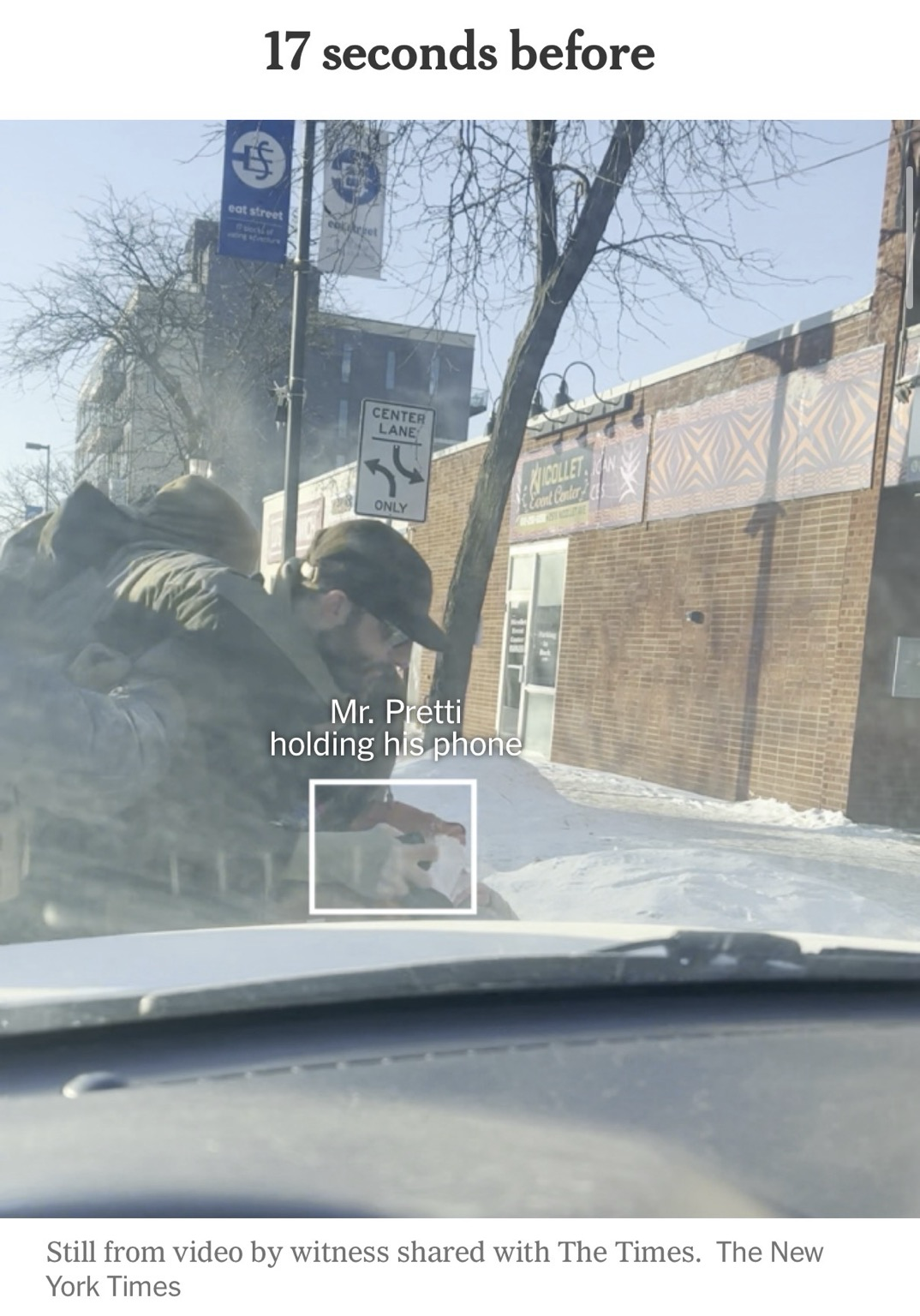 17 seconds before. Mr. Pretti holding his phone as agents push him against a car