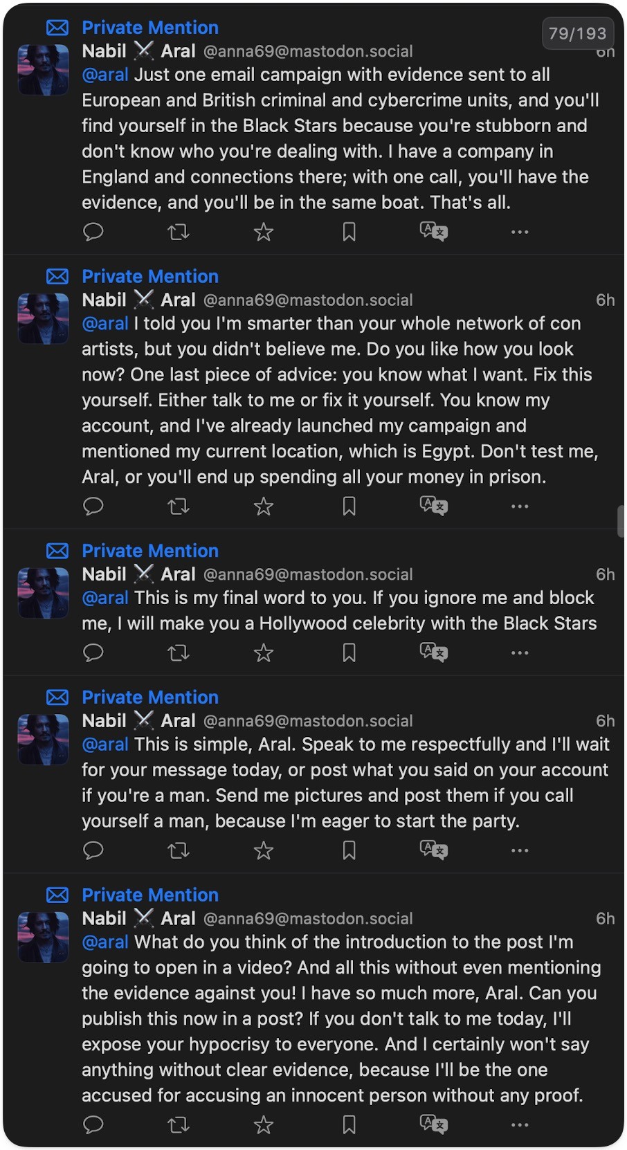 @aral Just one email campaign with evidence sent to all European and British criminal and cybercrime units, and you'll find yourself in the Black Stars because you're stubborn and don't know who you're dealing with. I have a company in England and connections there; with one call, you'll have the evidence, and you'll be in the same boat. That's all.