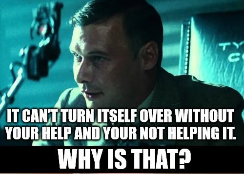 Blade Runner clip: It can't turn itself over without your help and you're not helping it. Why is that?