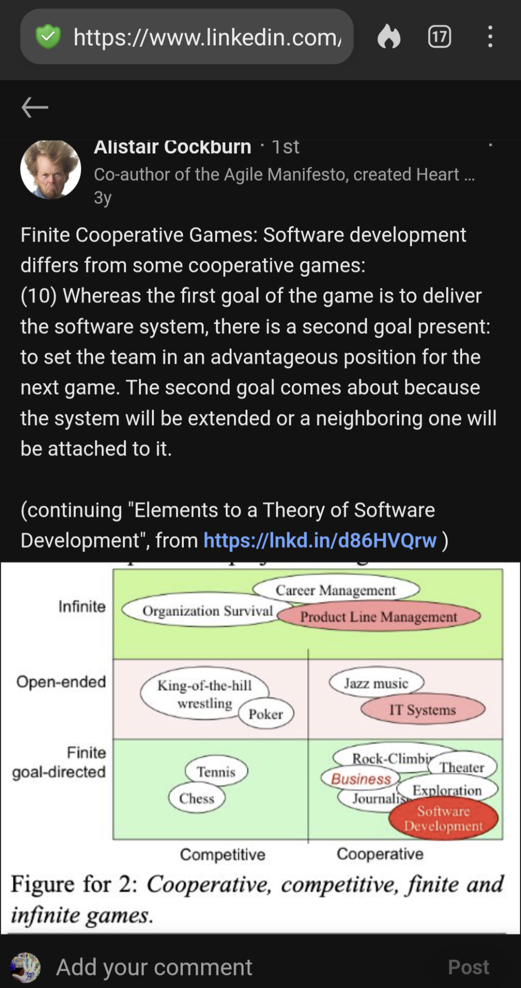 Linkedin post screenshot: Alistair Cockburn 1st Co-author of the Agile Manifesto, created Heart ... 3y Finite Cooperative Games: Software development differs from some cooperative games: (10) Whereas the first goal of the game is to deliver the software system, there is a second goal present: to set the team in an advantageous position for the next game. The second goal comes about because the system will be extended or a neighboring one will be attached to it. (continuing "Elements to a Theory of Software Development", from https://lnkd.in/d86HVQrw ) Image: a 2x2 matrix, with Vertical axis: Infinite - Open-ended - Finite goal-directed Horizontal axis: Competitive / Cooperative With human activities mapped onto its quadrants: Career Management Organization Survival, Product Line Management King-of-the-hill wrestling Poker Jazz music IT Systems Tennis Chess Rock-Climbing Theater Business Exploration Journalism Software Development Figure for 2: Cooperative, competitive, finite and infinite games.
