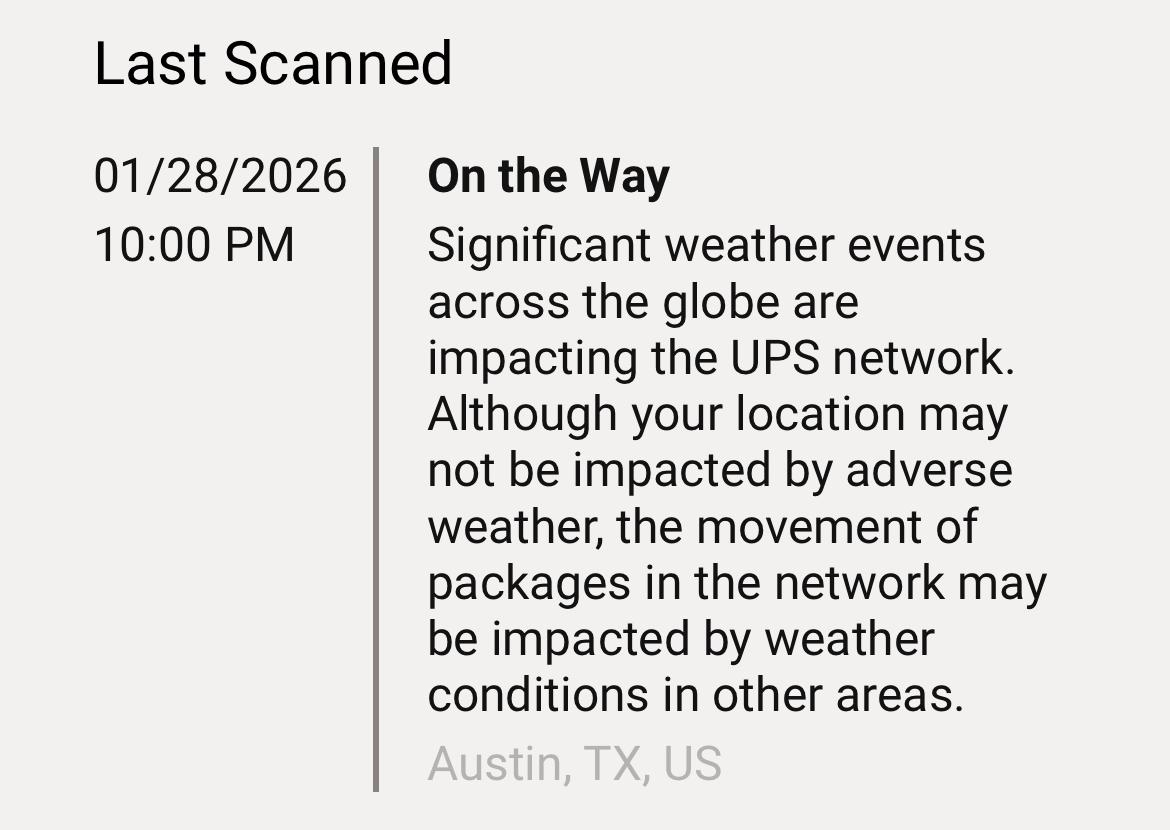 @thomasfuchs Good luck! I have a delivery with UPS that originated in Austin, TX on the 23rd and was last scanned on the 28th in... Austin, TX.