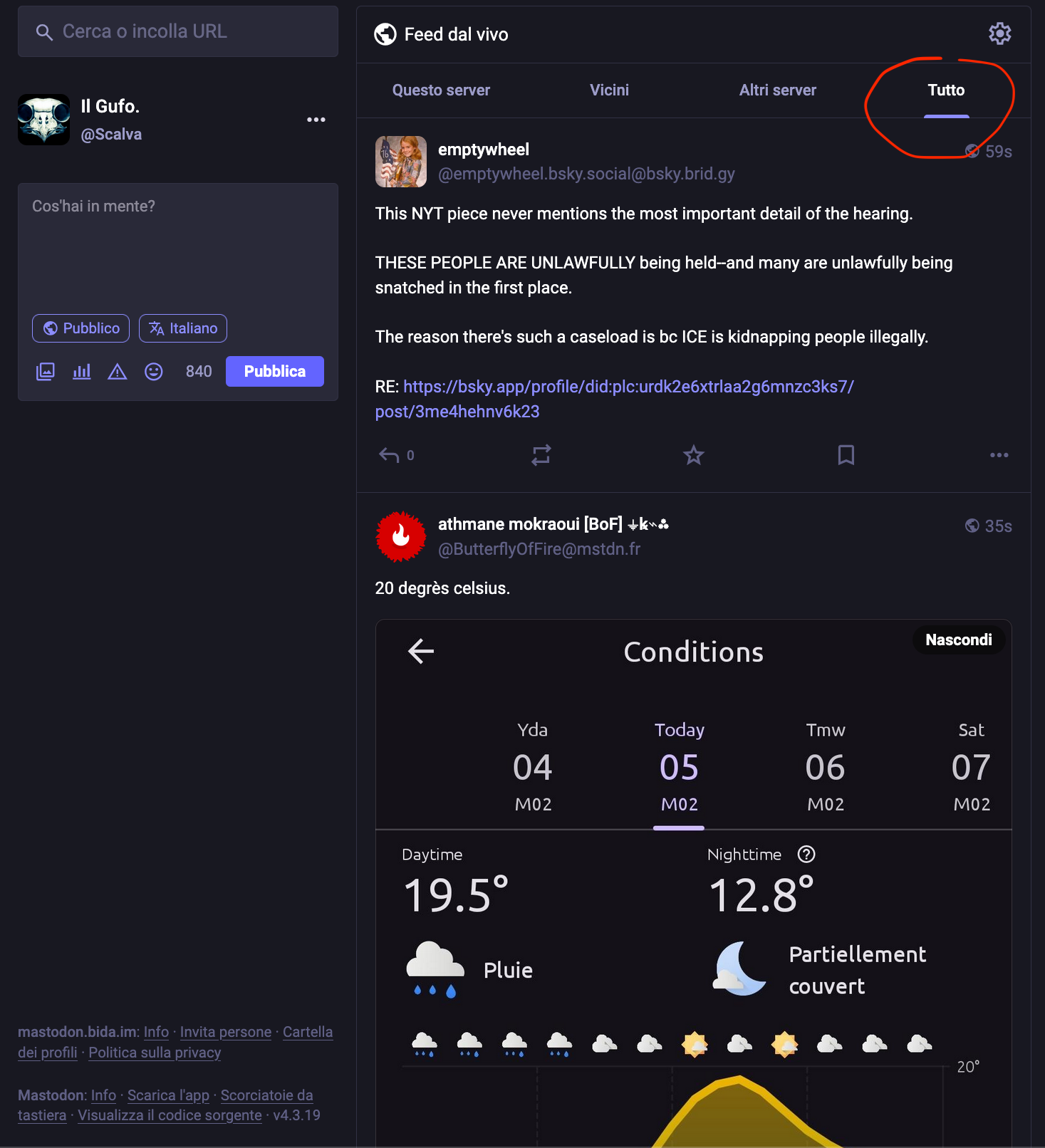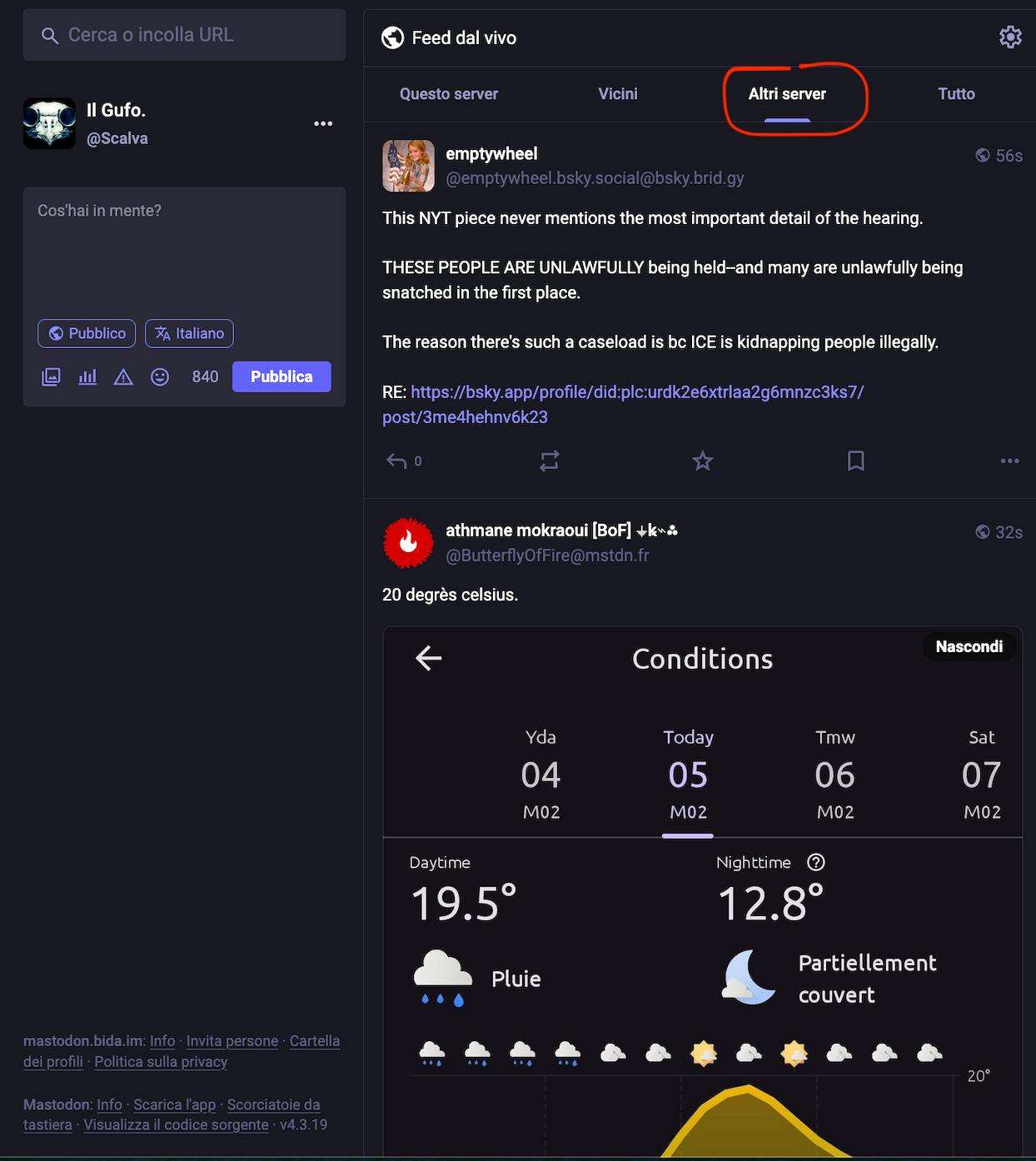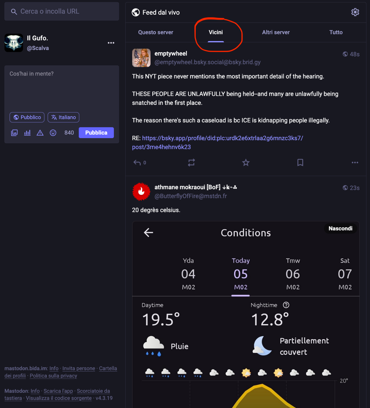 Il Gufo. @Scalva@mastodon.bida.im replied · activity timestamp 6 days ago @admin @leonardo ...anzi, le tre tl vicini, altri server e tutto mi compaiono identiche Read more Read less Translate Reply Boost or quote Boost Quote You cannot quote this post Like More actions Copy link Flag this comment Block