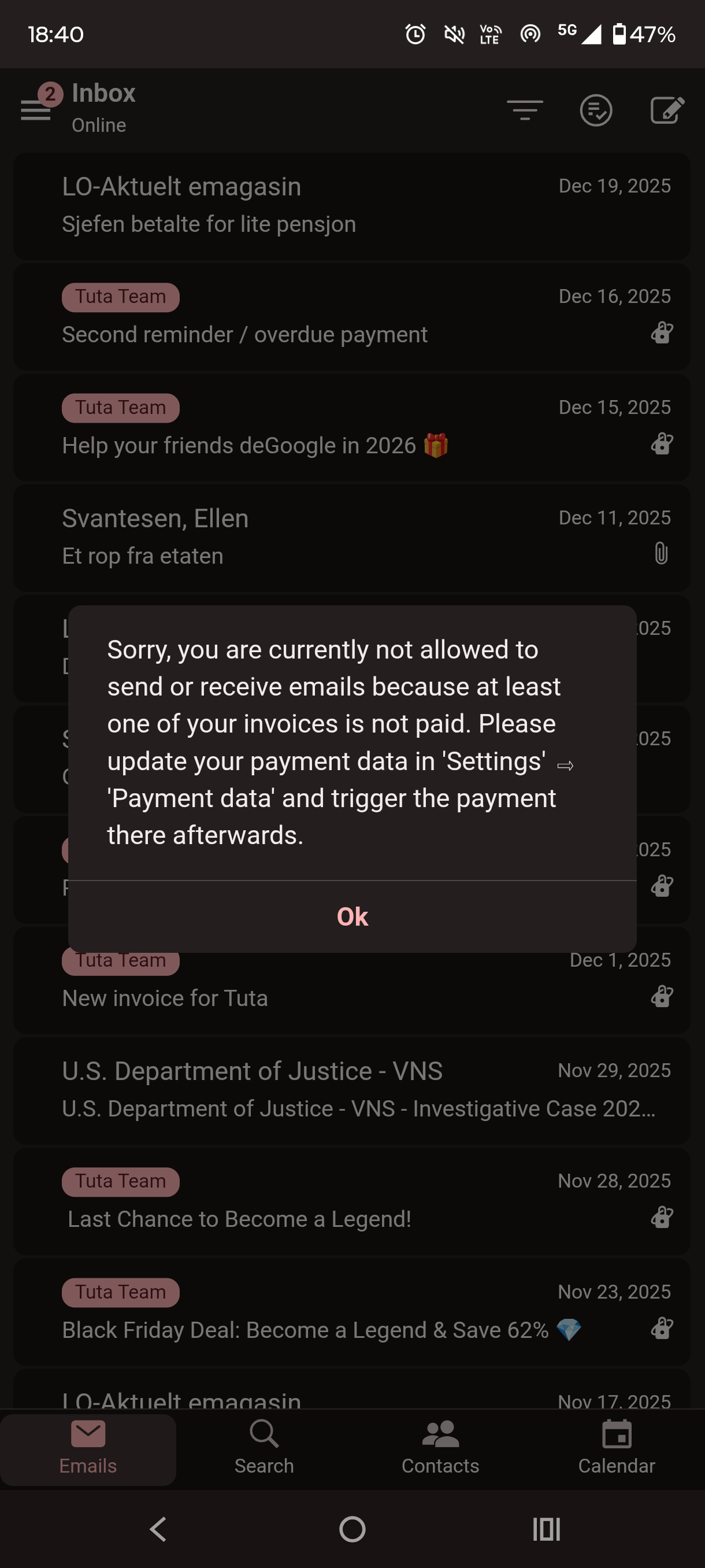 Also, paid accounts recieve invoices on the day they are due. At this point it's too late to downgrade to free, Tuta will hold your account ransom and not allow you to recieve more emails until you pay another year.