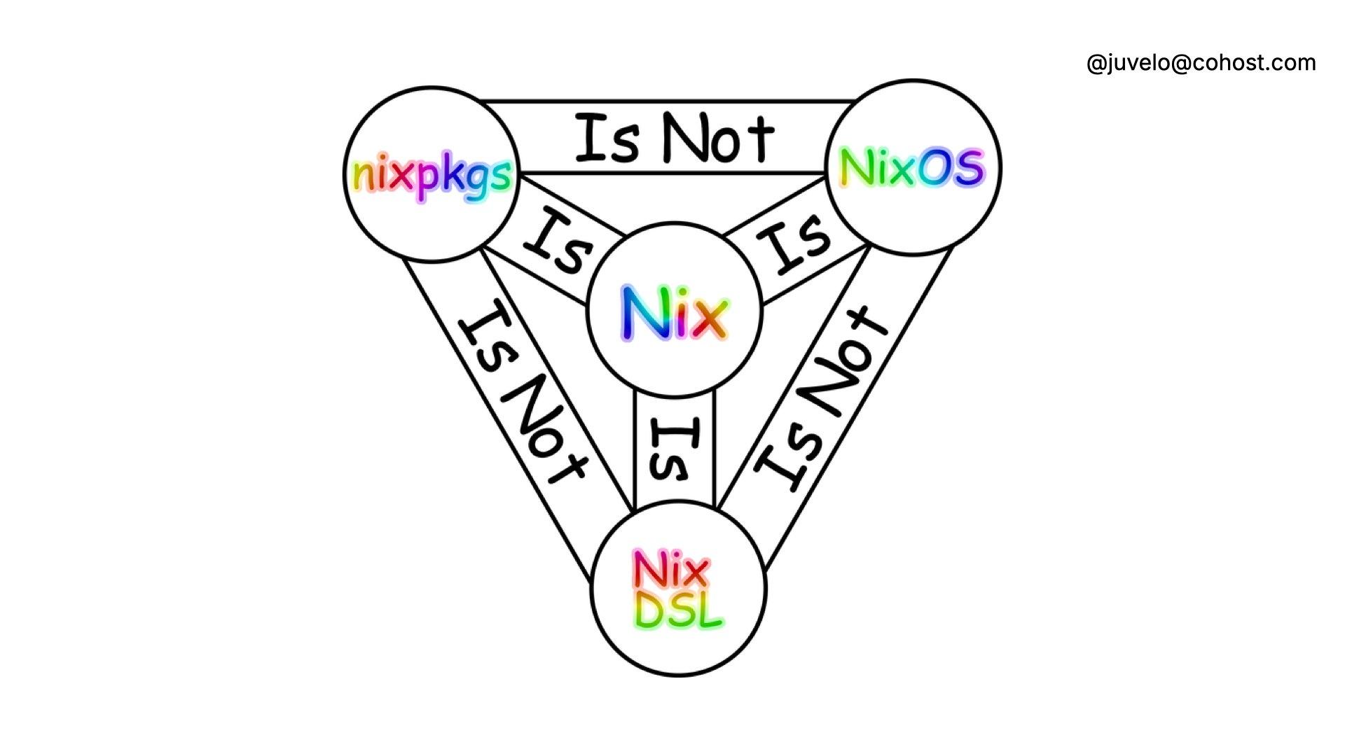 A triangle with "Nix" in the center surrounded by the words "nixpkgs", "NixOS " and "Nix DSL". The last three are each connected by "is not", while they are all connected to the Nix center by the word "is".