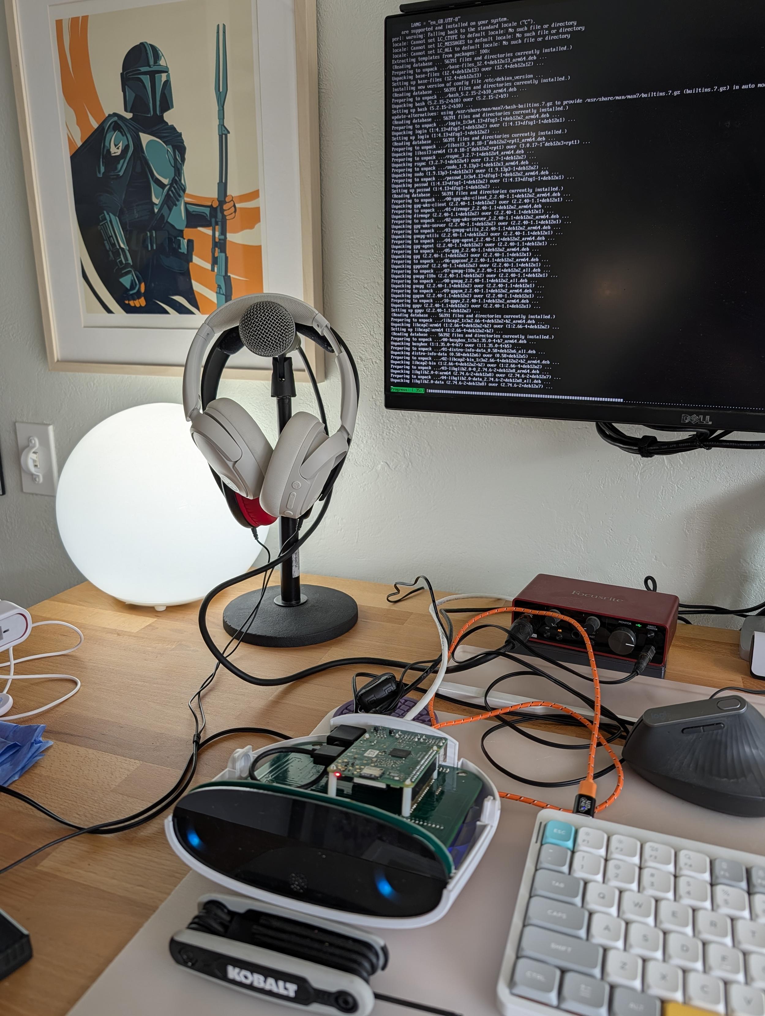 Mycroft upside down and opened up, connected to a display that is showing some apt updates