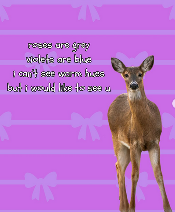 From the Oklahoma Dept of Wildlife, a picture of a mule deer against a pink background with a bow pattern Text reads "roses are grey, violets are blue, i can't see warm hues but i would like to see you"