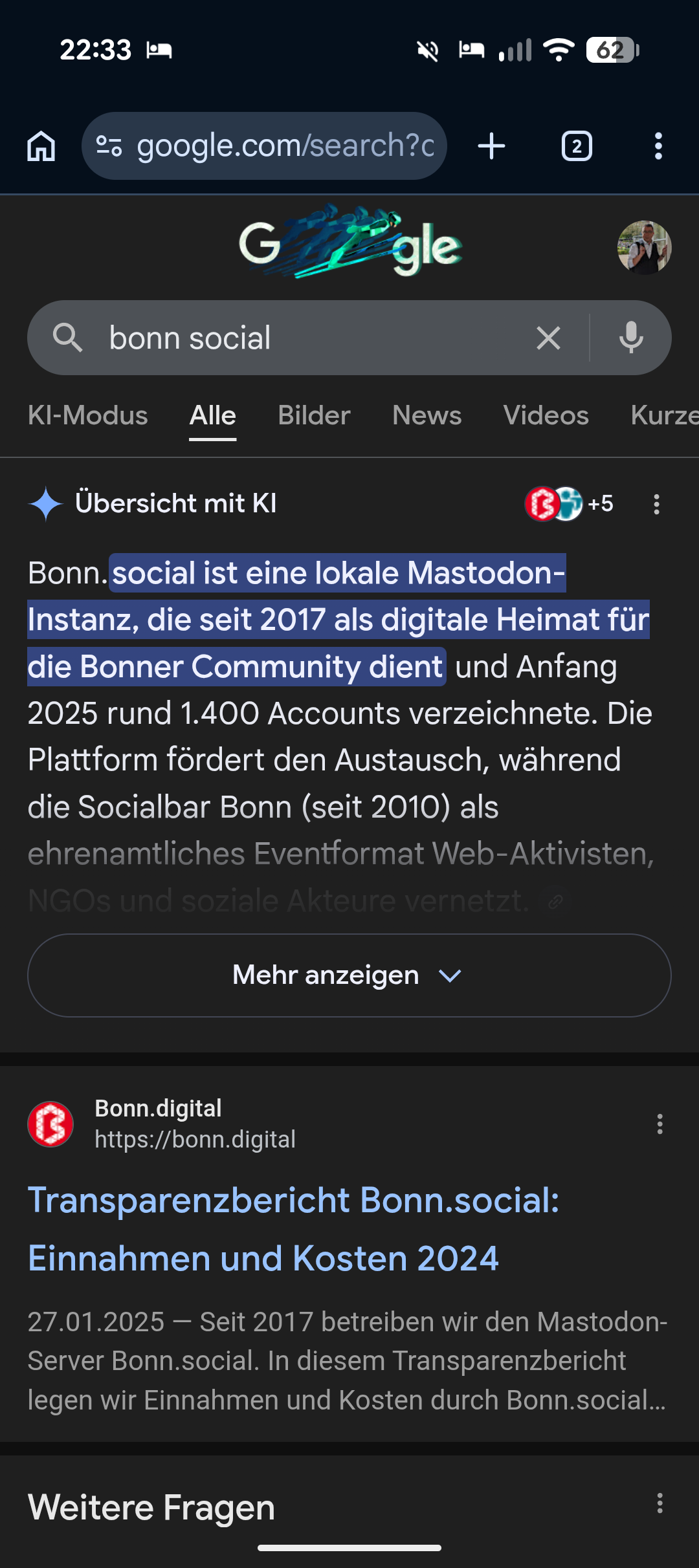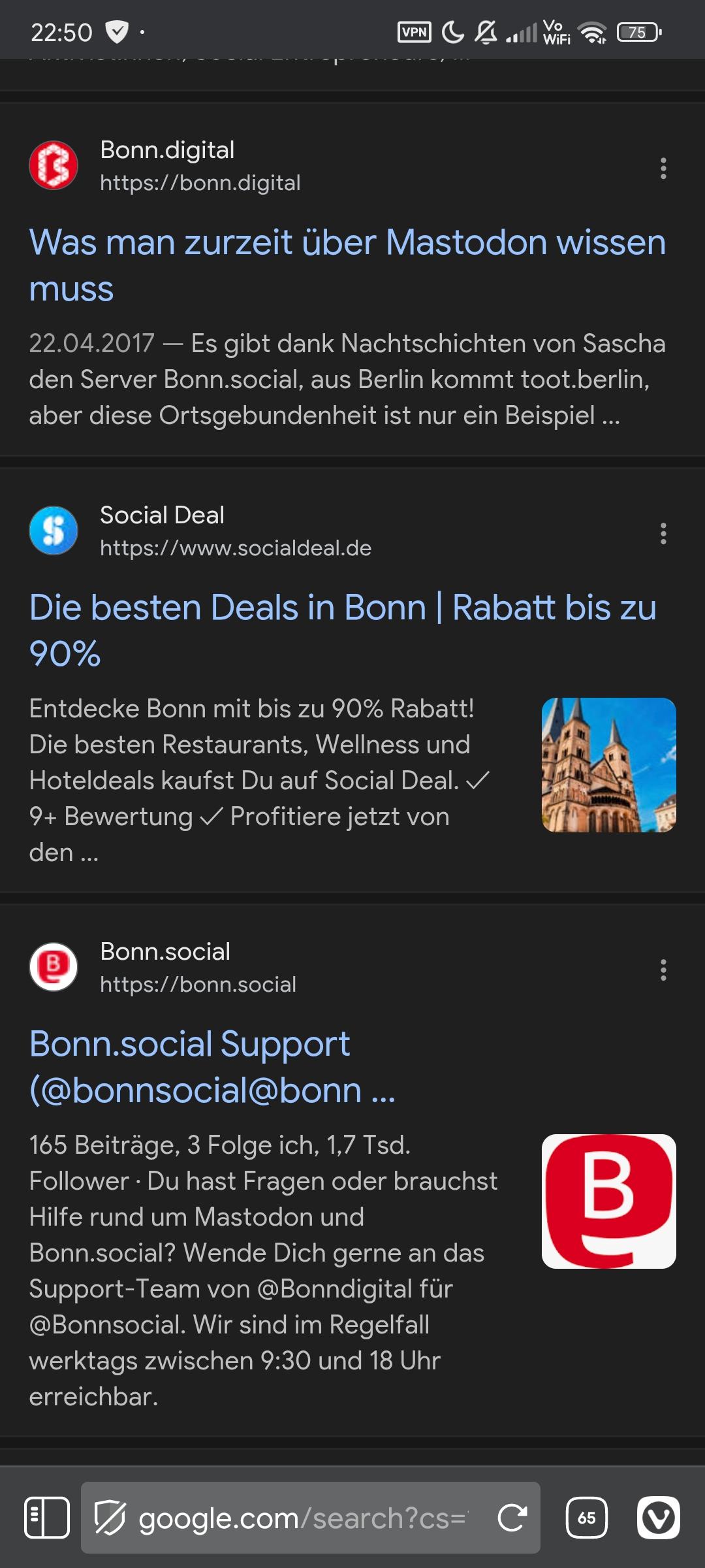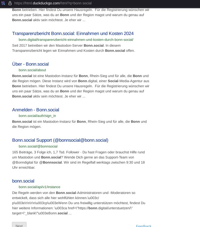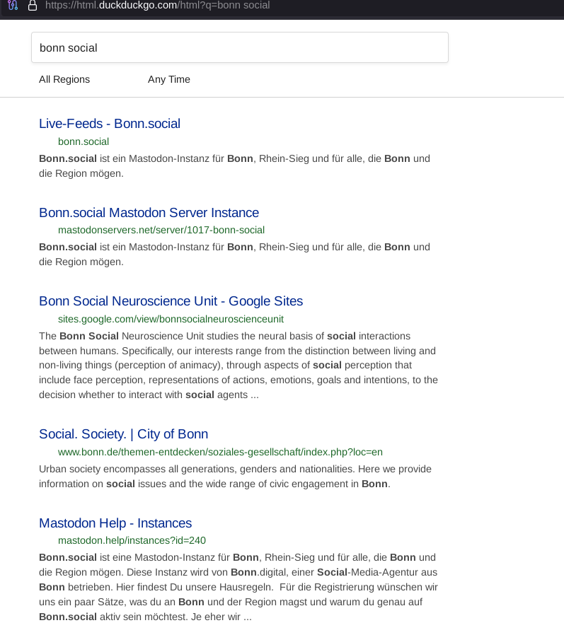 Kann es sein, dass Google Bonn.social versteckt? Sucht bitte mal nach „Bonn social“ in der Suchmaschine eurer Wahl und schreibt Name und Postion als Antwort. Ich hab’s heute Leuten zeigen wollen, die dann auf dem Handy, iOS auf Google gesucht haben und dann kein passendes Ergebnis bekamen. Danke!