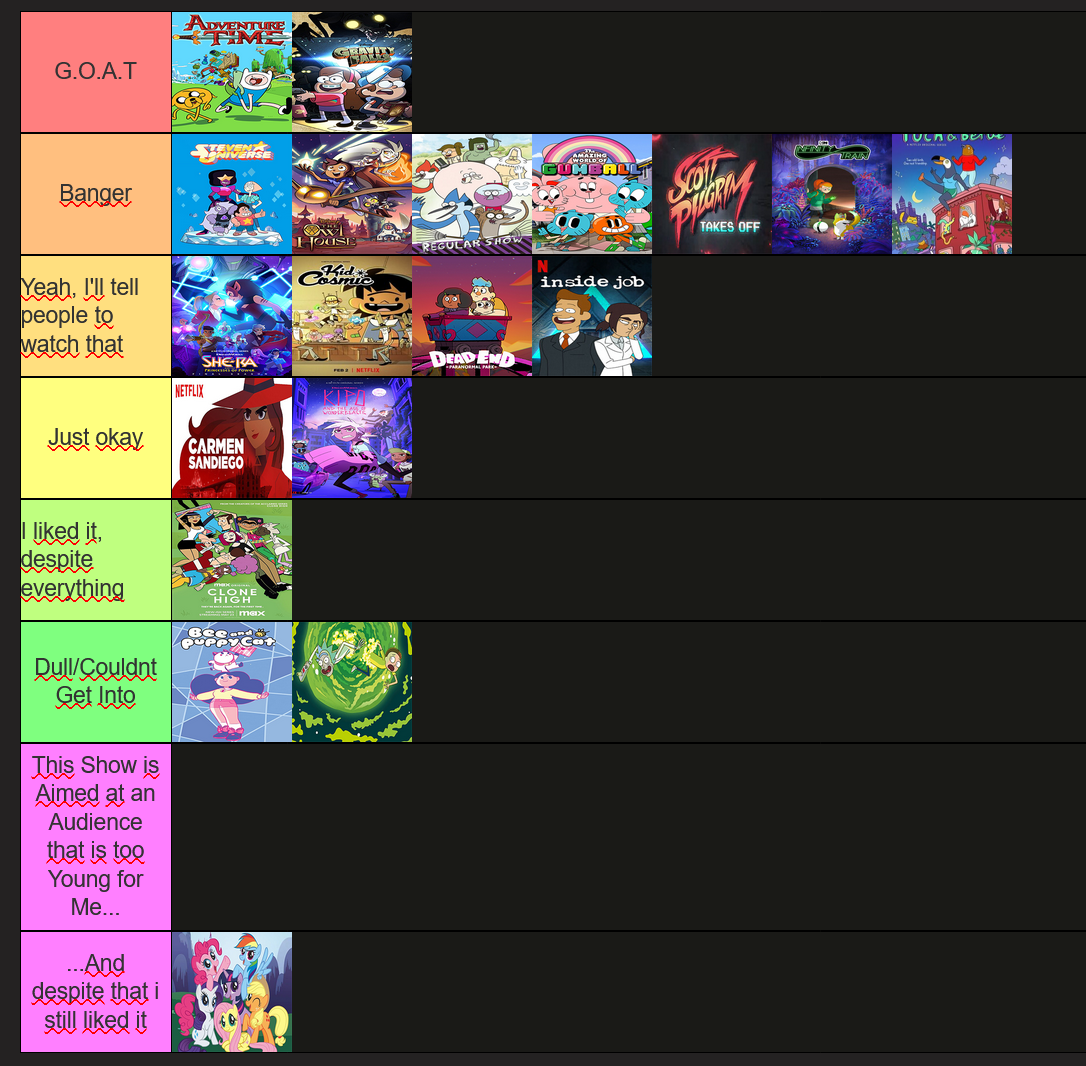 ex-tumblrina @Butch2Therapie@anticapitalist.party · activity timestamp 9 months ago I've made a "cartoons i've watched tier list" Read more Read less Translate alt Sorry, no caption provided by author Sorry, no caption provided by author Reply Boost Quote pending approval Like More actions Copy link Flag this post Block