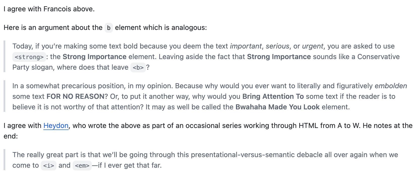 > In revisiting CKEditor recently I am impressed with how far it has come since I last used it, but to have a policy that is different with respect to `strong` than for `em` is confounding.
