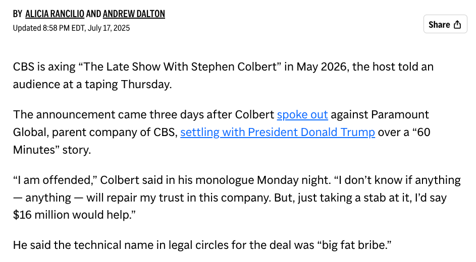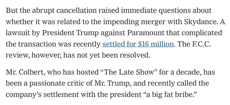As of 845p, this ongoing story makes no mention yet of Trump's blackmail of CBS/Paramount/Ellison but includes generic hoo-ha about changing TV: a journalistic sin of omission. Trump is taking over media under the Times' nose and it turns away. https://www.nytimes.com/2025/07/17/business/stephen-colbert-late-show-ending.html?smid=tw-share