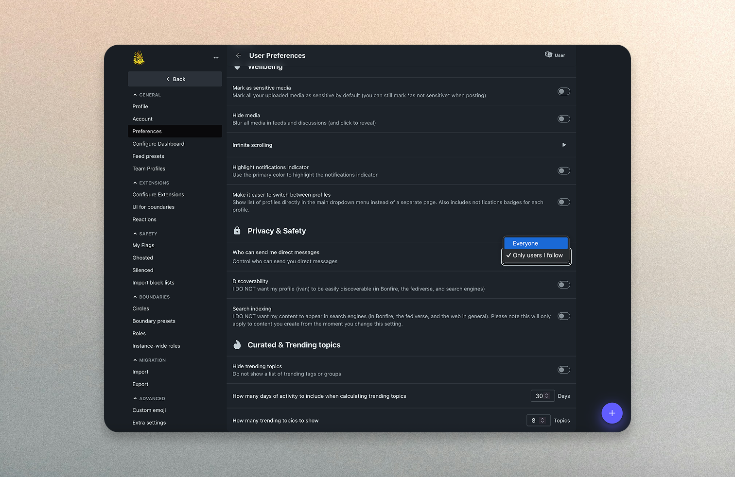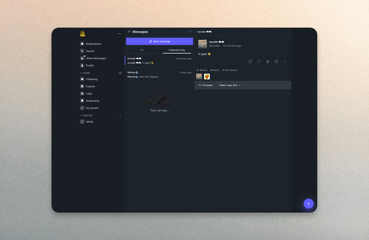 There's now a new setting under "privacy" to decide the default active tab in the DM view (fig 1) and we've implemented filtering DMs by "followed only" (fig 2) as the lowest hanging fruit 🍓 .