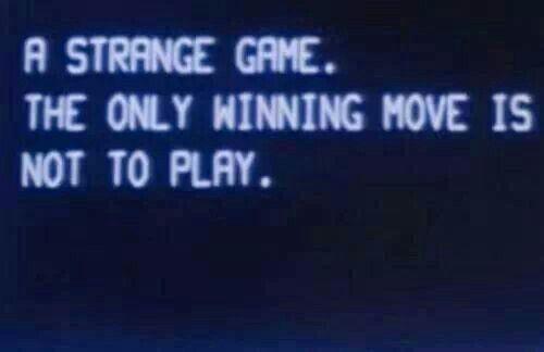 A screenshot, of a computer screen, from the movie, War Games. The only thing displayed on the monitor is text which reads, “A STRANGE GAME. THE ONLY WINNING MOVE IS NOT TO PLAY.”