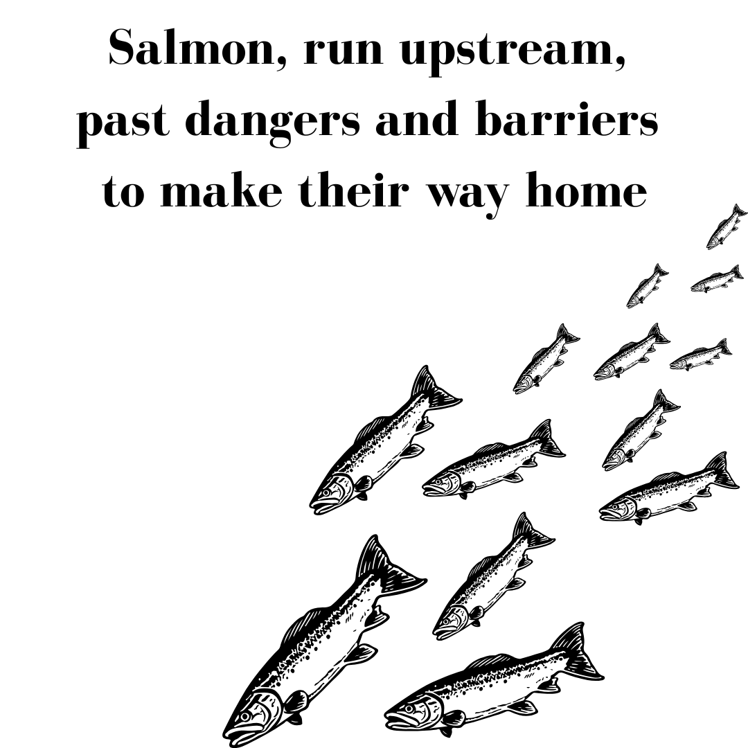poem with graphic of school of salmon Salmon, run upstream, past dangers and barriers to make their way home