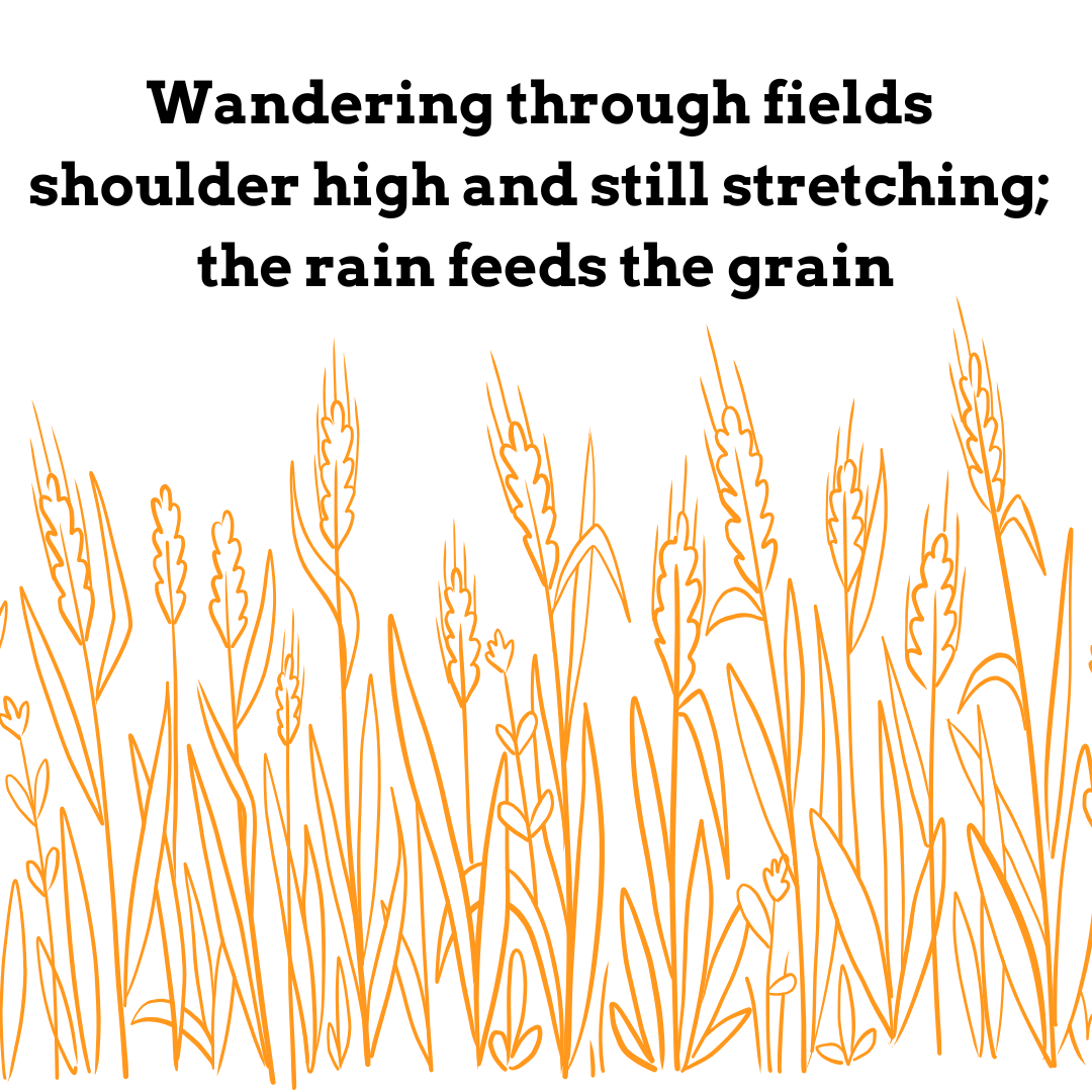 poem with illustration of grain plants Wandering through fields shoulder high and still stretching; the rain feeds the grain