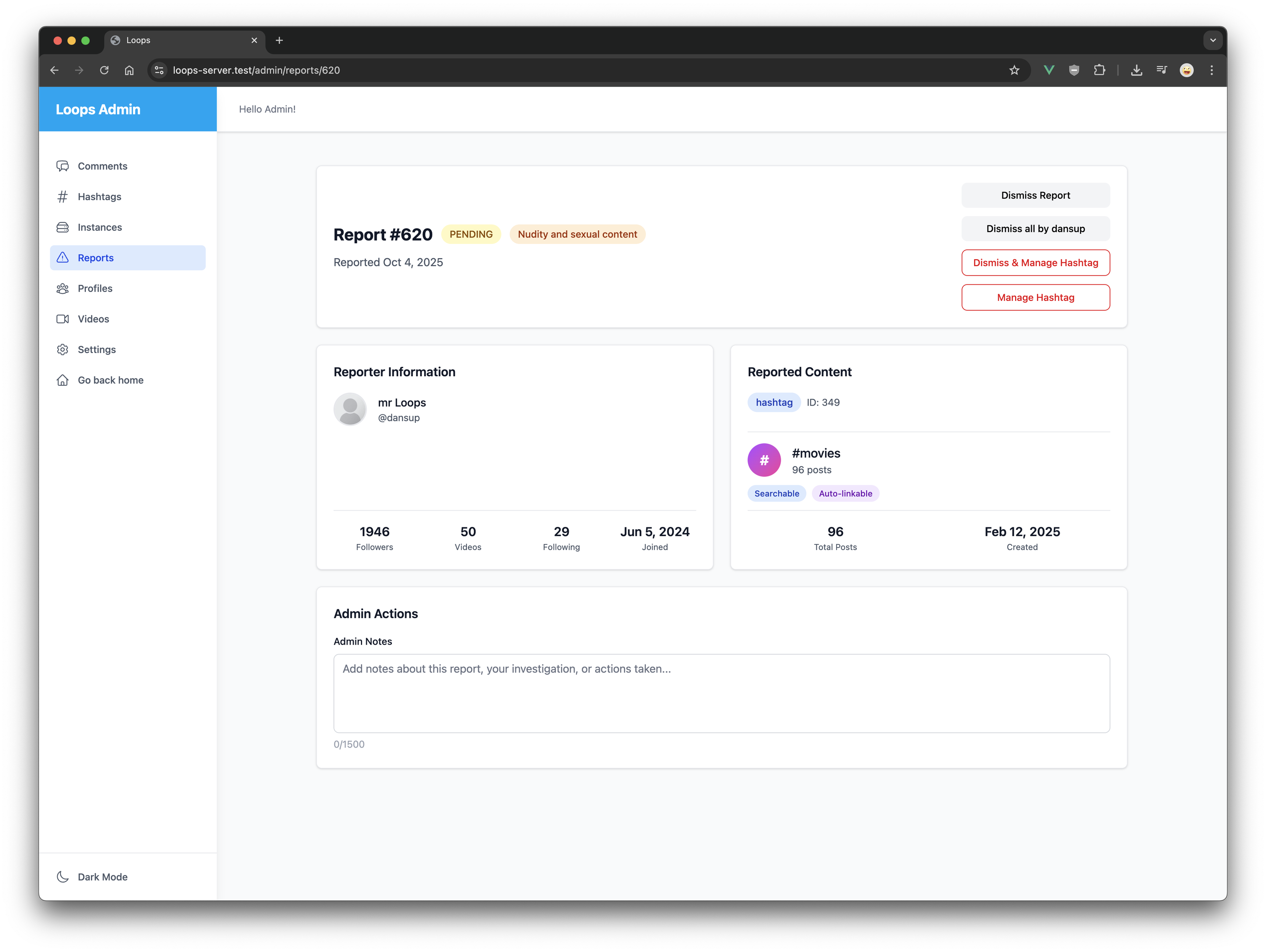 I also refactored the Admin Dashboard to handle hashtag reports, and also added deep linking to open hashtag management to make the handling of reports easier 馃槑