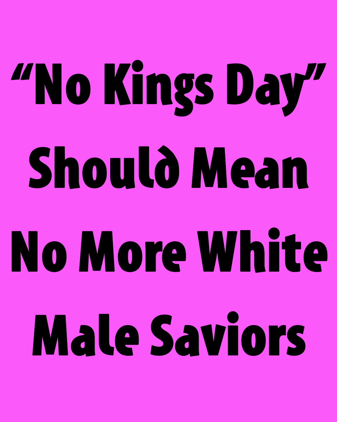 So as you hold your signs and chant for “No Kings,” remember, you can’t dismantle monarchy while worshiping the myth of white male saviors. You can’t demand liberation while centering comfort. You can’t imagine a new world while refusing to confront the ways you benefit from the old one.