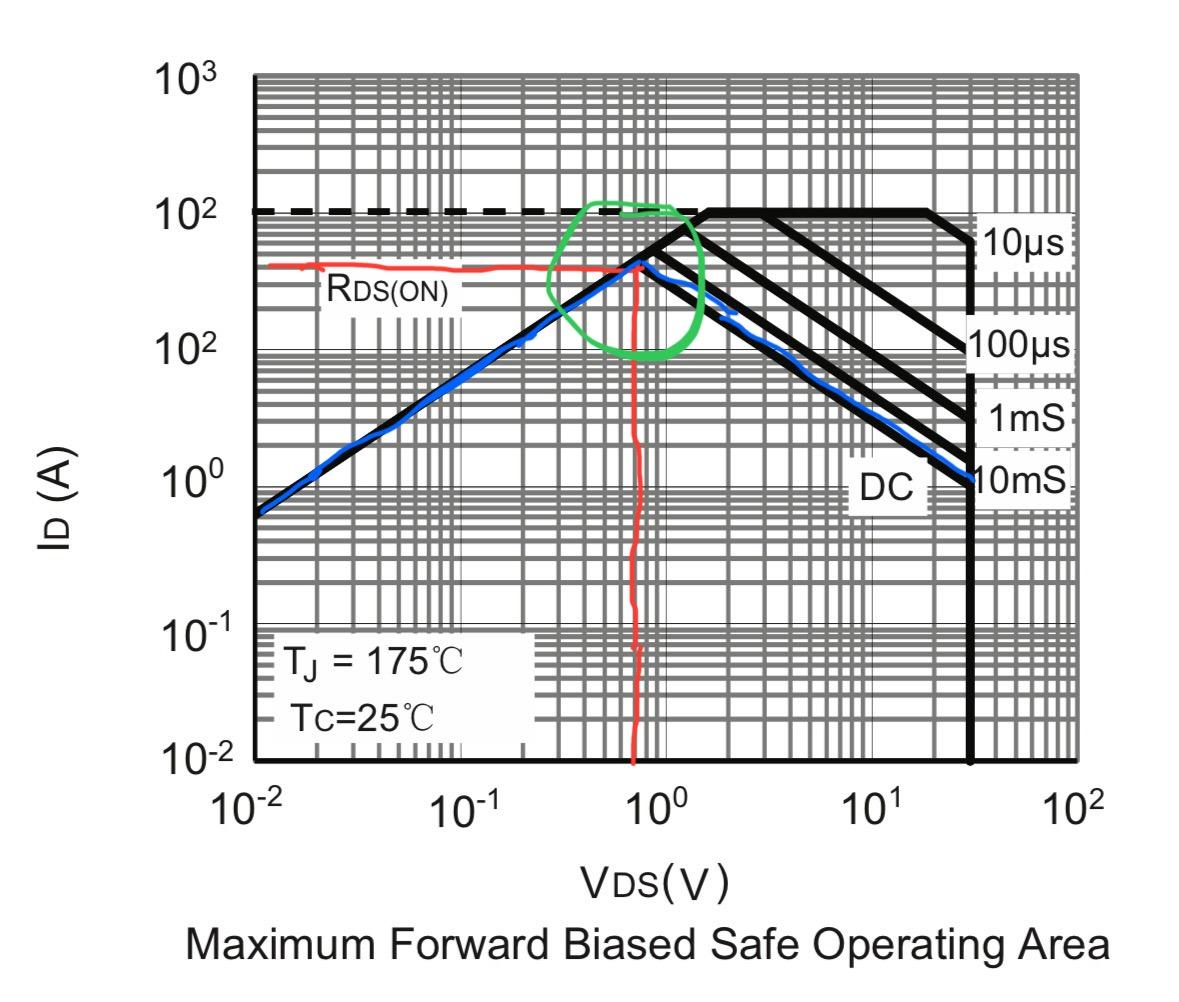 So, take a look at the DC rating line in the safe operating area, and where it peaks - about 0.7V V(d-s) and 40A I(d). LIAR LIAR PANTS ON FIRE!!!