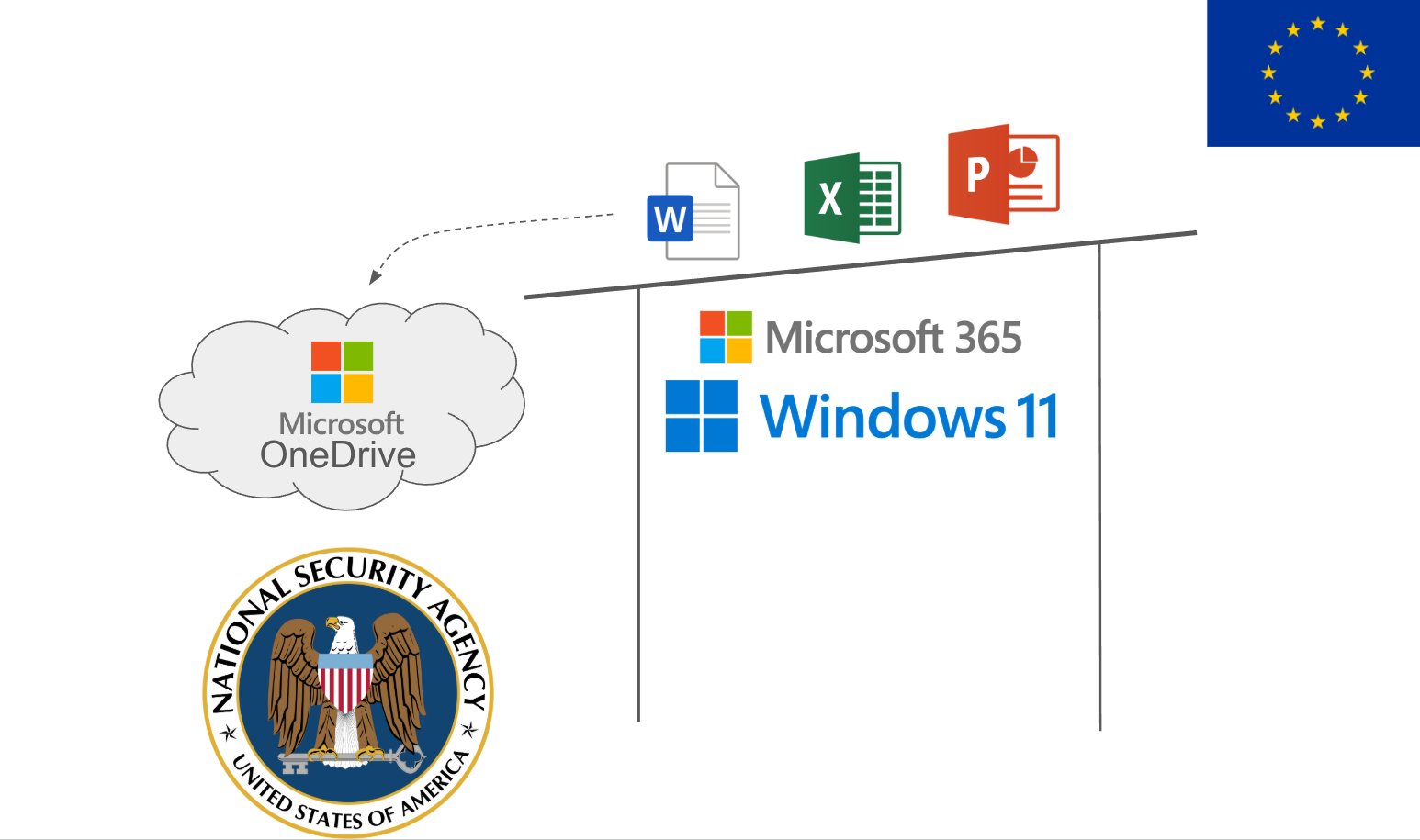 A slanted table representing Microsoft 365 and Windows 11. On the table are logos for Word, Excel and PowerPoint, and they are sliding off the table towards a Microsoft OneDrive cloud. Under this cloud is the logo of the US National Security Agency. At the top right is an EU flag.