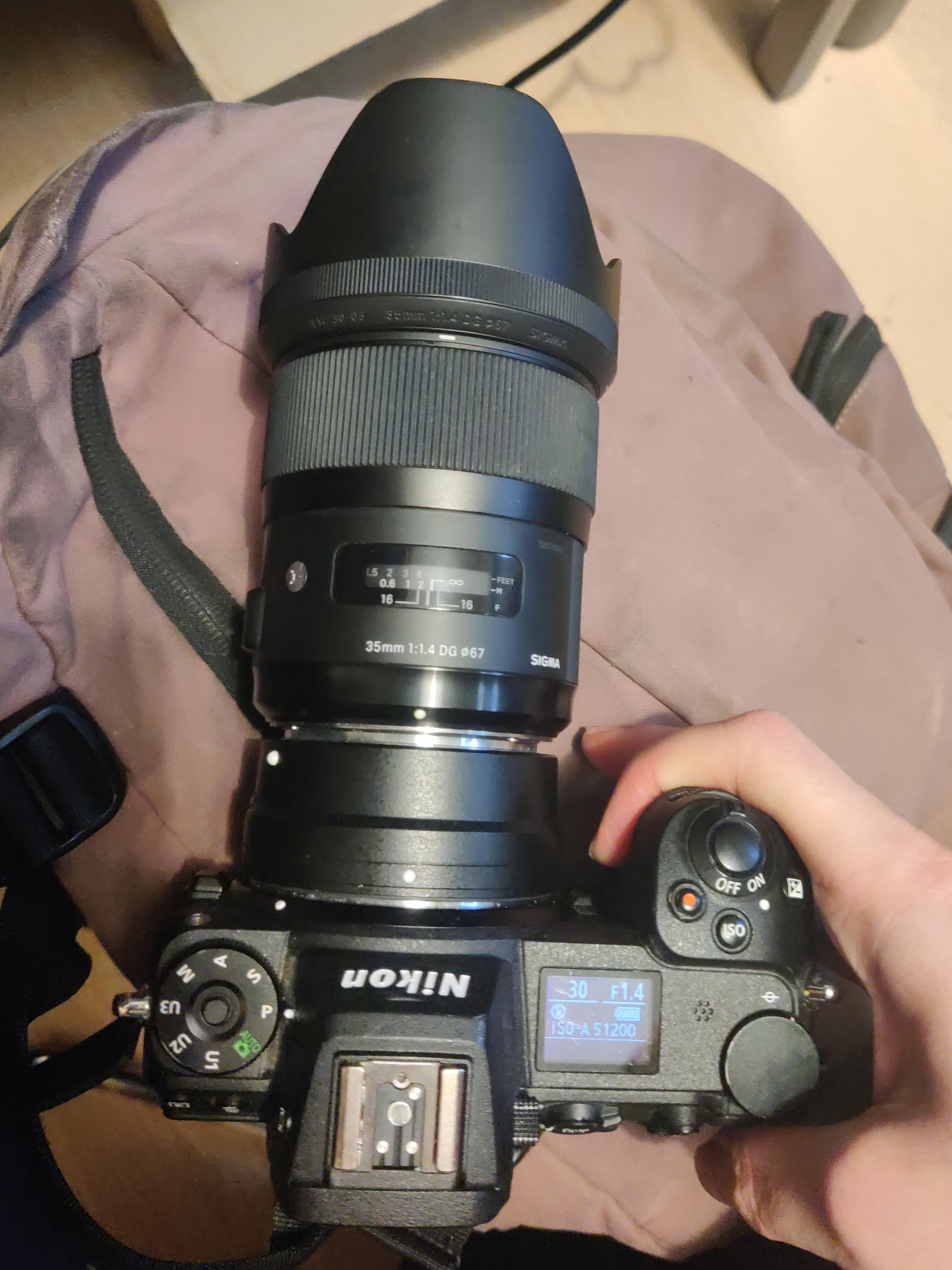A Nikon camera with a Z-to-F mount adapter and a very not small 35mm on the front. Its heavy