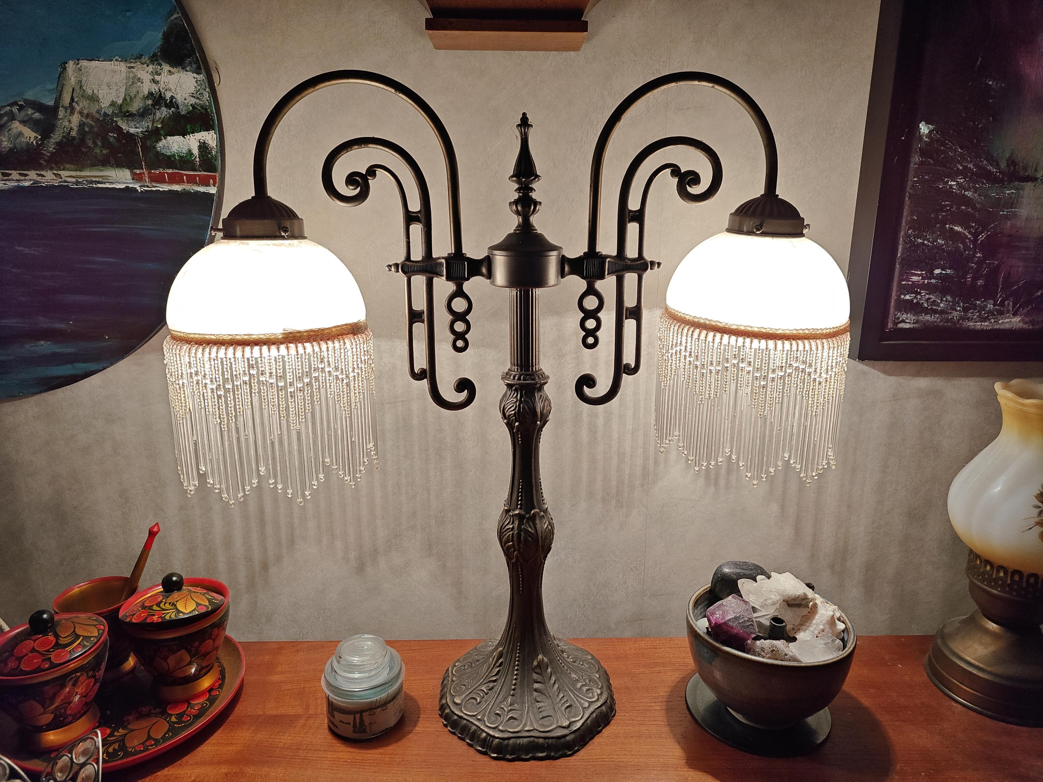@brennen Vintage 1940s that belonged to my grandparents. Settings are one light, other light, both lights. Only my mom and I seem to love it but I love it a lot, despite the base requiring constant dusting (pictured).