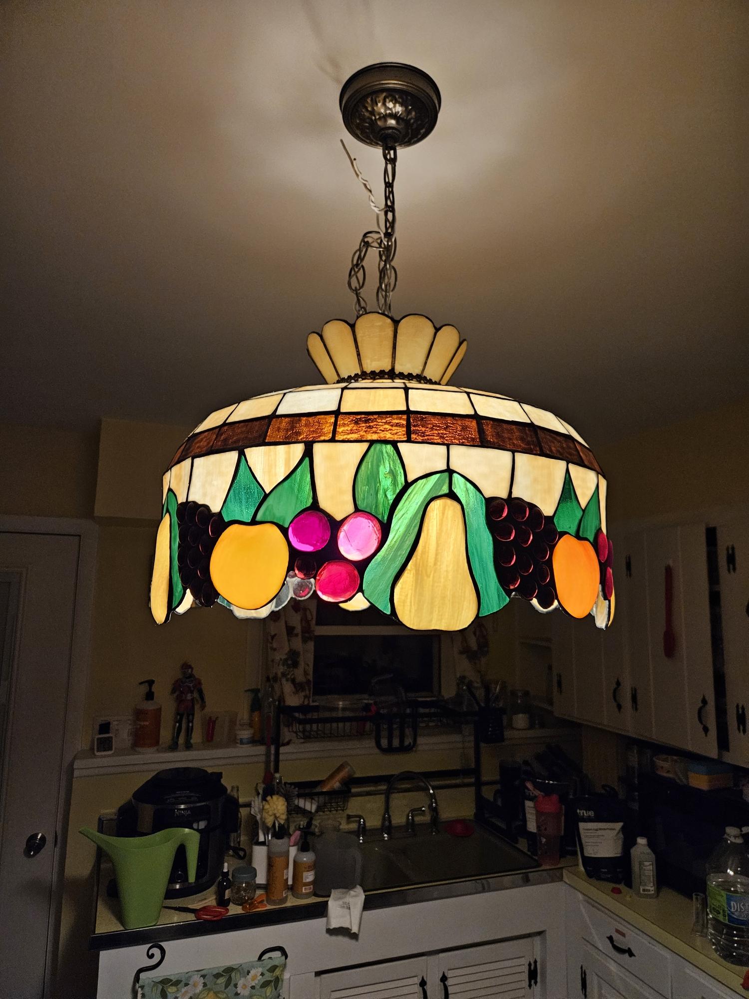also the faux tiffany (real stained glass but this isn't an actual Tiffany design) pendant in my kitchen, i fucking love this thing