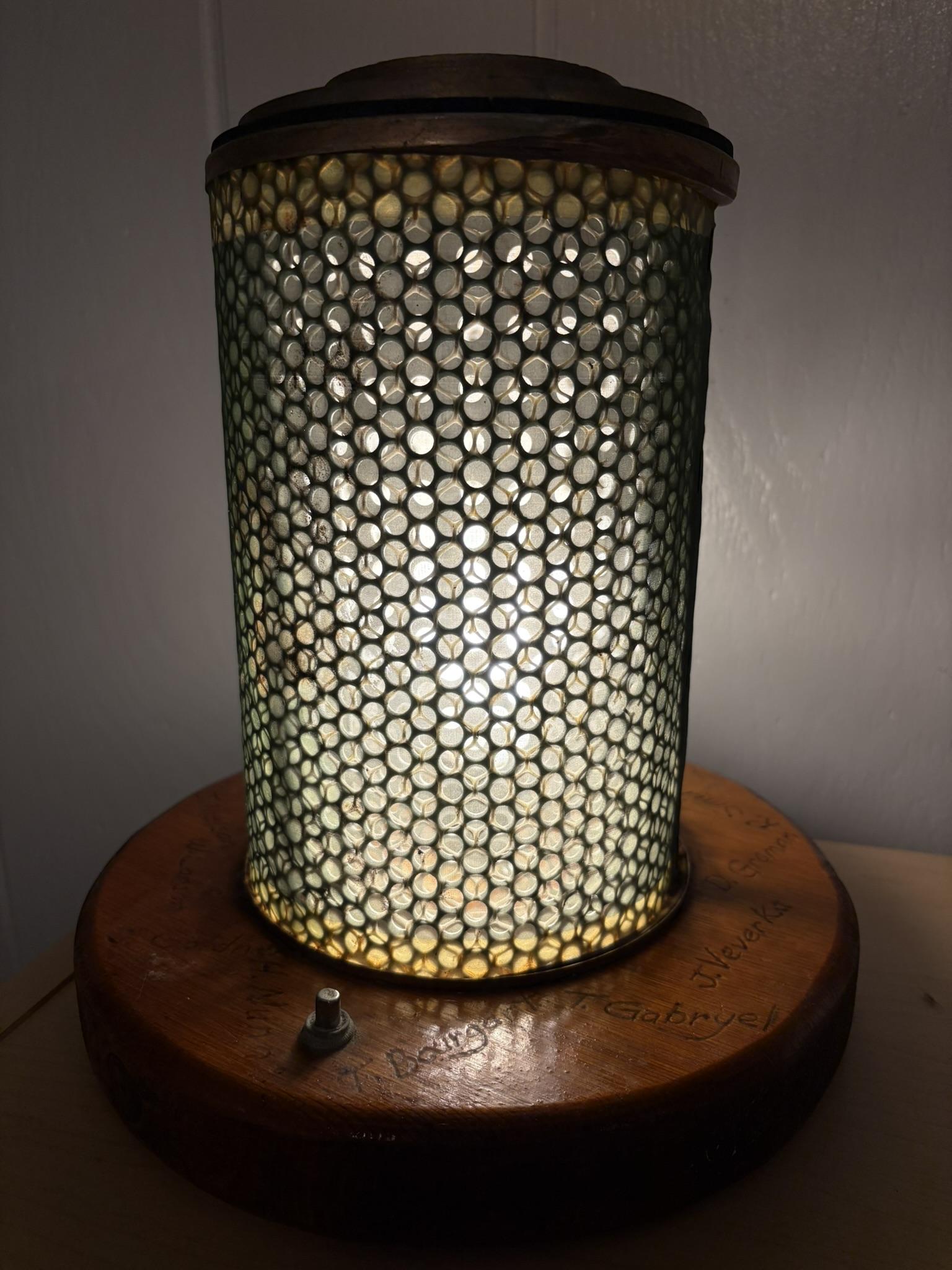 It was a camshaft from a John Deere diesel engine, welded to a brake rotor for the base. The base was JD green, with a lampshade up top.
