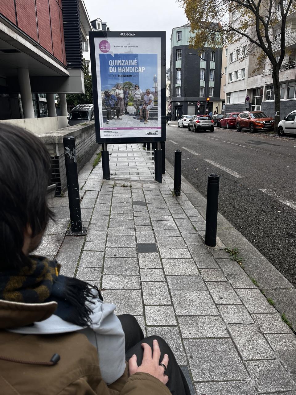 Rue. Trottoir. Une personne en fauteuil roulant fait face à un panneau publicitaire qui empêche complètement de passer sur le trottoir. La publicité : «  Riches de nos différences, QUINZAINE DU HANDICAP du 3 au 15 novembre 2025, leHavre. »