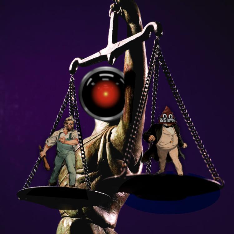 Blind justice holding a set of scales aloft. Her head has been replaced with the hostile red eye of HAL 9000 from Stanley Kubrick's '2001: A Space Odyssey.' On the scales stand a worker and a millionaire, in belligerent postures. The millionaire's head has been replaced with the enshittification poop emoji, with angry eyes and a black, grawlix-scrawled bar over its mouth.