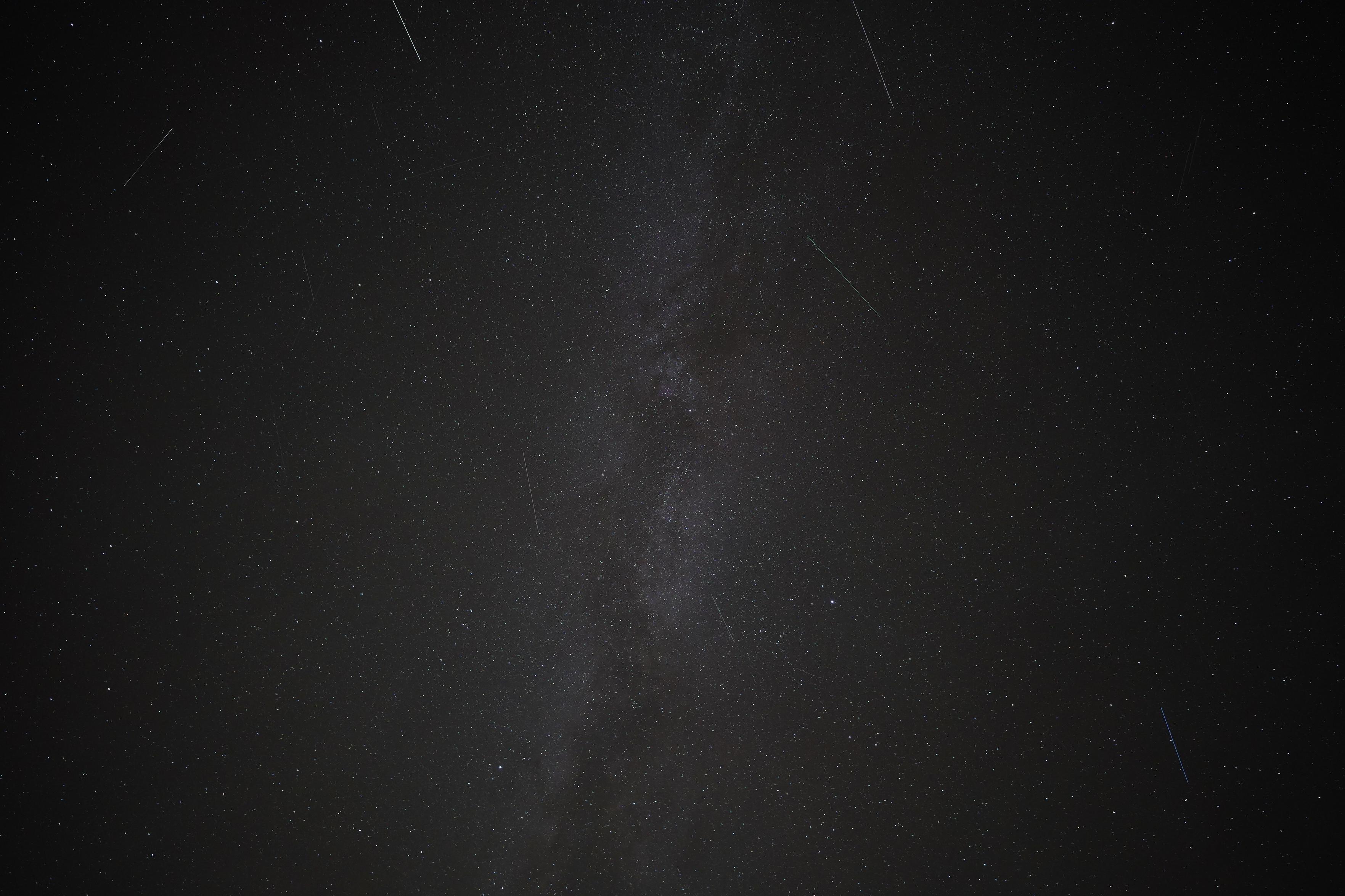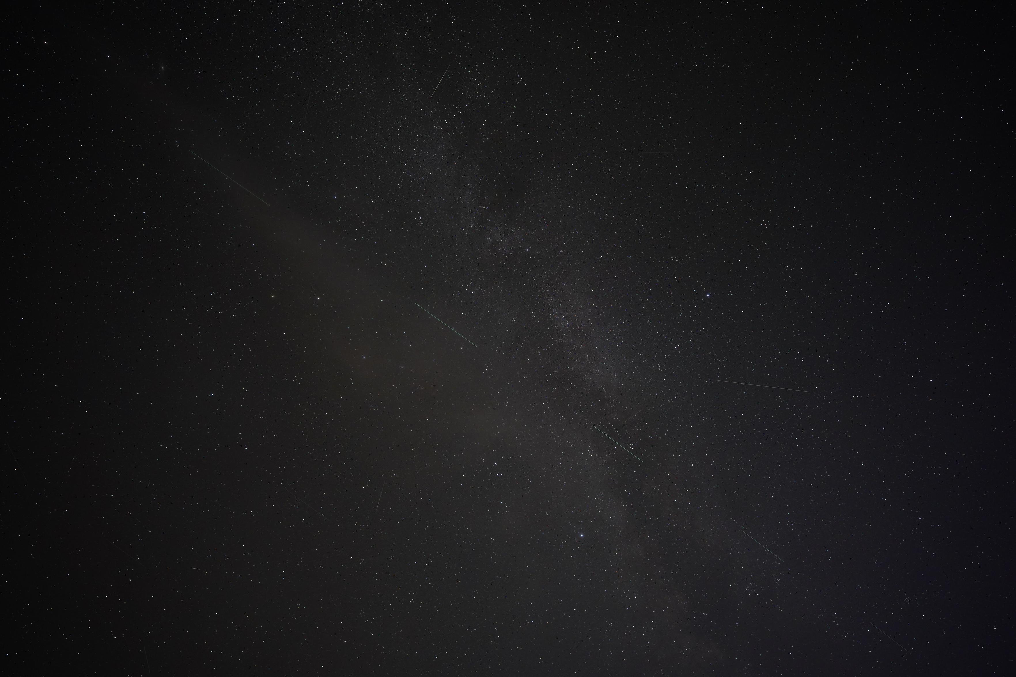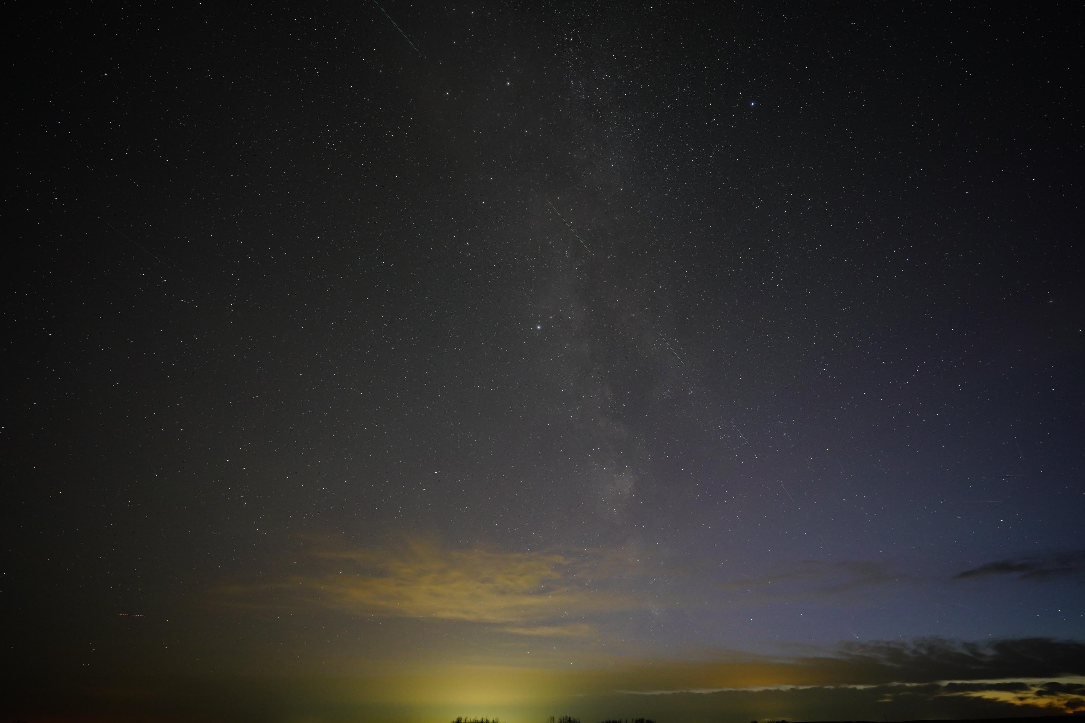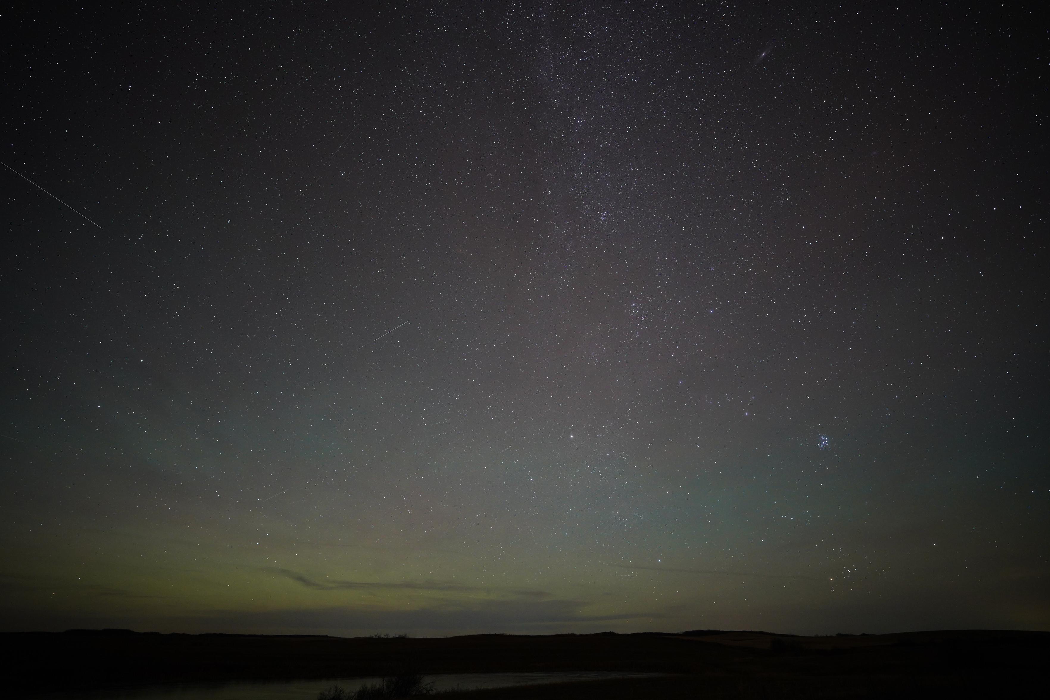 Looking toward the city of Regina, more than 100km away, you can see clouds lit up by city light pollution, and a tiny bit of sunset light visible. Above it, there's the Milky Way stretching vertically up from the city, and a chain of satellite streaks going diagonally across the whole scene. Thanks, Starlink.