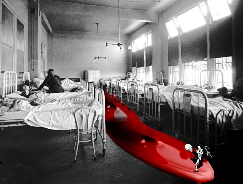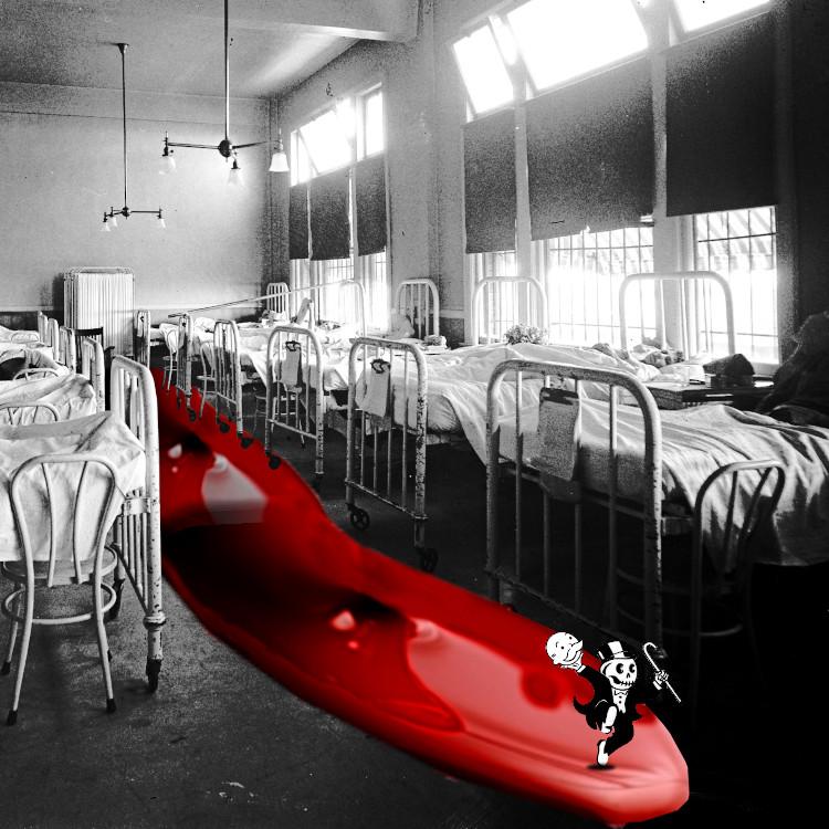 A black and white photo of an old hospital ward. A bright red river of blood courses between the beds. Dancing in the blood is Monopoly's 'Rich Uncle Pennybags.' He has removed his face to reveal a grinning skull.