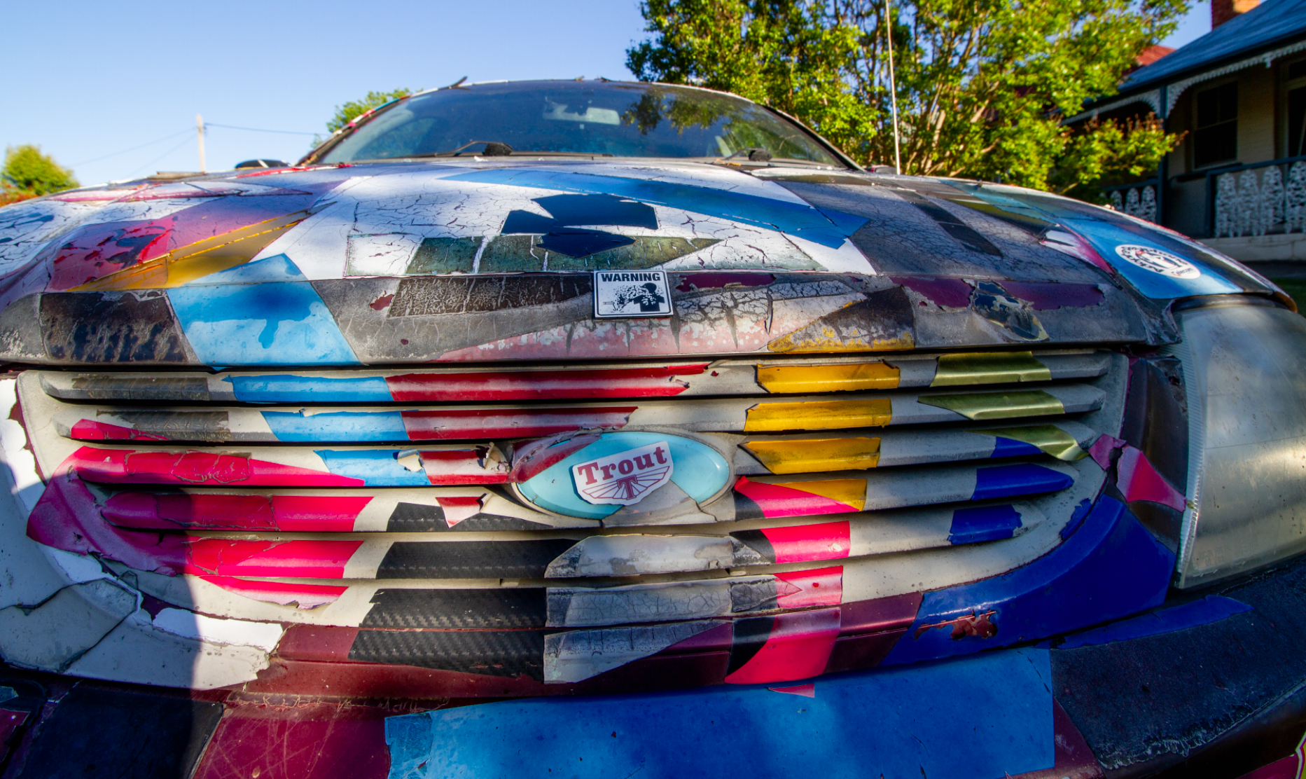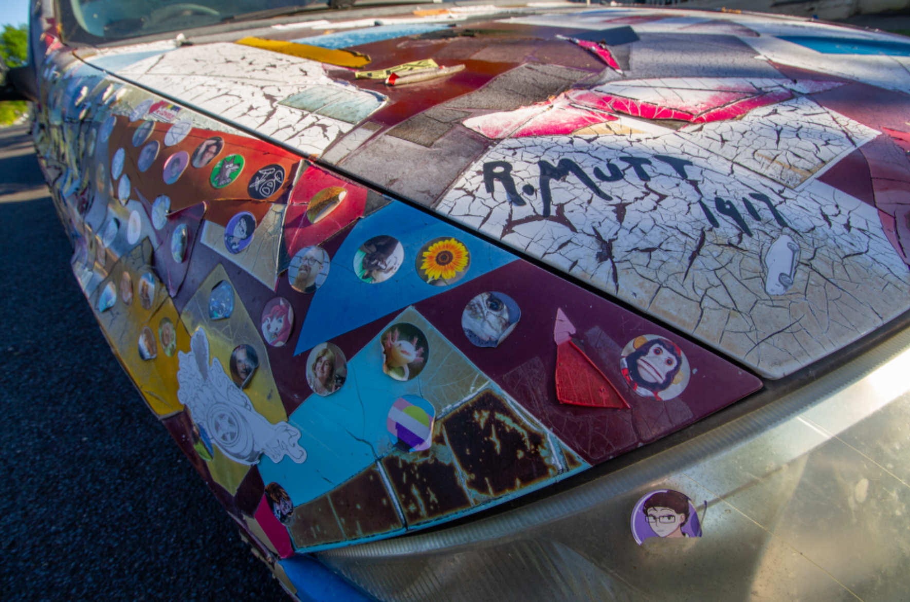 A wide-angle photo of the front drivers' side corner of an AU Falcon covered in old, weathered and entirely messed up stickers of various kinds and types. Some of the stickers have cracked and crazed badly, others sre still shiny and colourful. On the front guard are profile pics of various bluesky folk, and on the bonnet is the text R. Mutt 1917, for obvious reasons.
