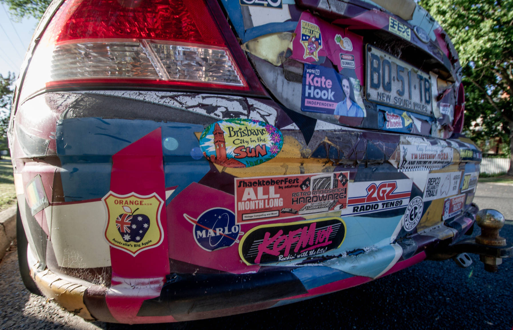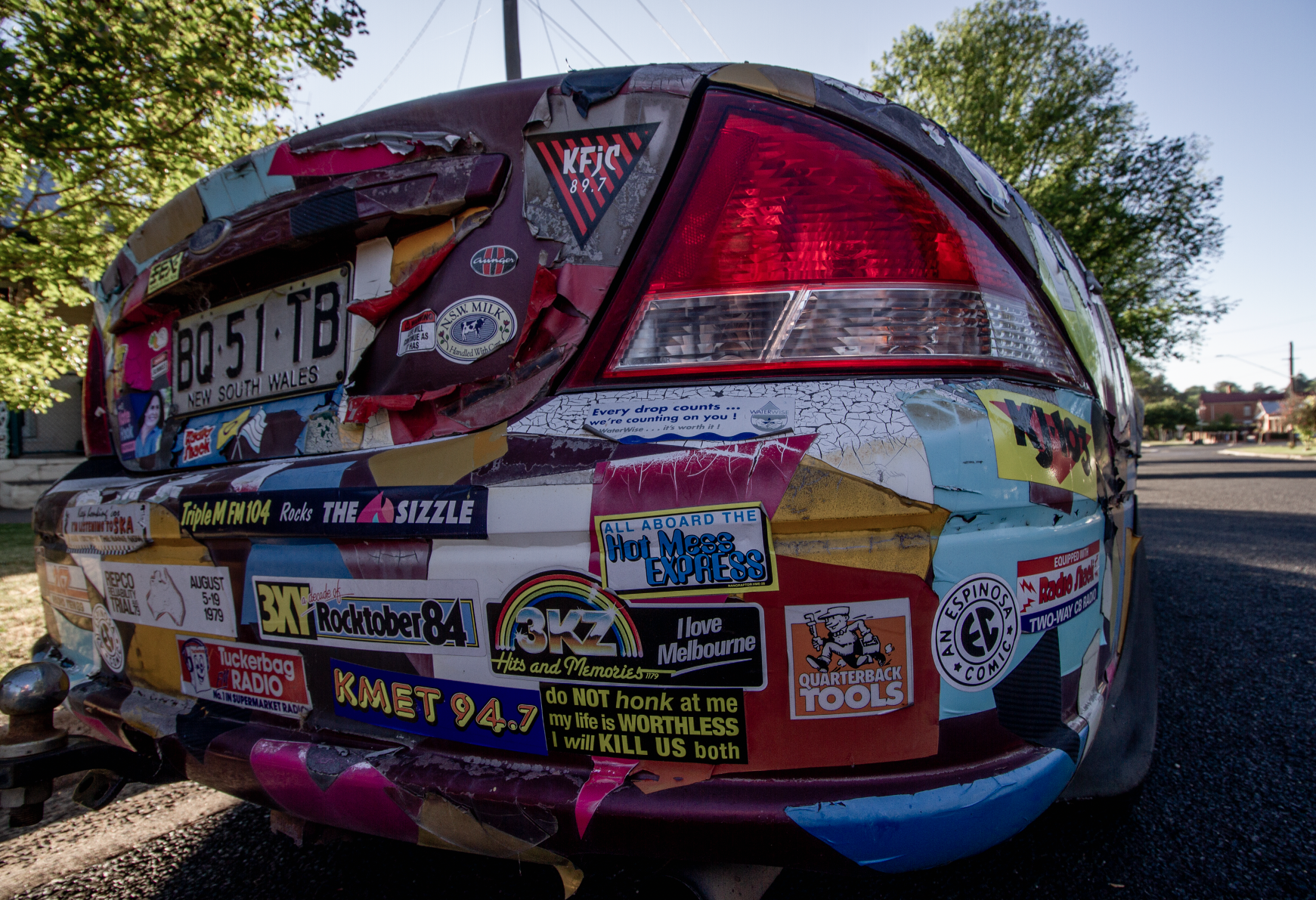 A low-down wide-angle photo of the passenger's side rear of an AU Falcon covered in old, weathered and entirely messed up stickers of various kinds and types. Some of the stickers have cracked and crazed badly, others sre still shiny and colourful. Most of the rear of the boot and bumper is covered in re-made but now messed-up bumper stickers. The sun shines bright from the left.