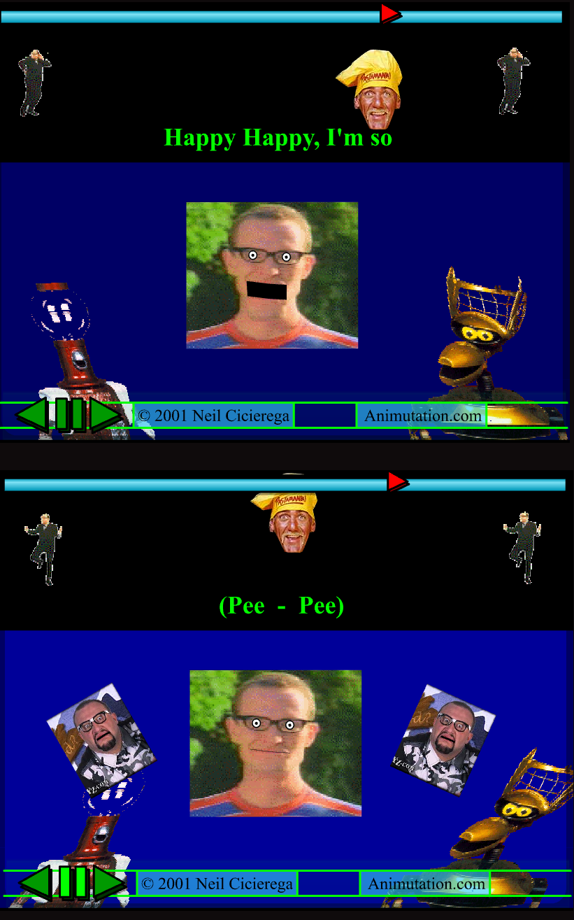 2-up screenshots from an animated video with a song that say: Happy Happy, I'm so (Pee - Pee) There is a weird guy "singing" who may or may not be that guy from the Adventures of Pete and Pete with random animations of things like wrestlers flying around the screen.