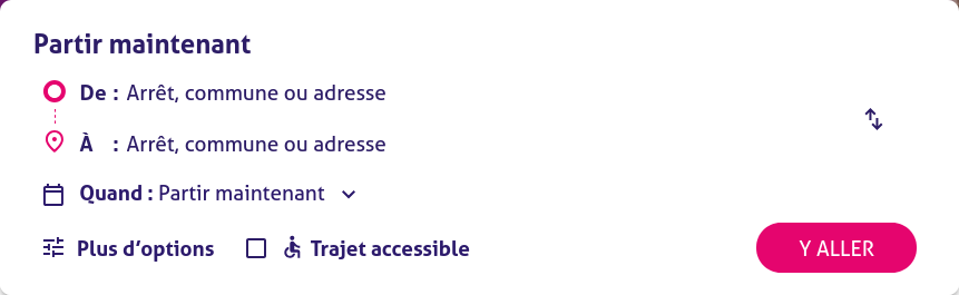 Formulaire de saisie de parcours en transport. Les deux champs "de" et "à" ne sont pas visibles. Mais on voit les textes d'accompagnement (placeholder) "arrêt, commune ou adresse" comme si c'était du simple texte, laissant croire que ce bloc n'est pas du tout interactif.