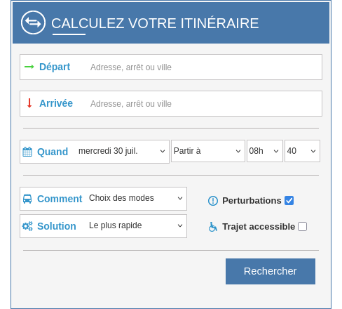 Capture d'écran d'un formulaire de saisie d'un itinéraire, avec les champs correspondant au départ, la destination, l'heure de départ, la méthode de calcul de l'itinéraire, les modes de transports utilisés ainsi que la prise en compte des perturbations et de l'accessibilité des transports. Tout les champs sont clairement visibles.