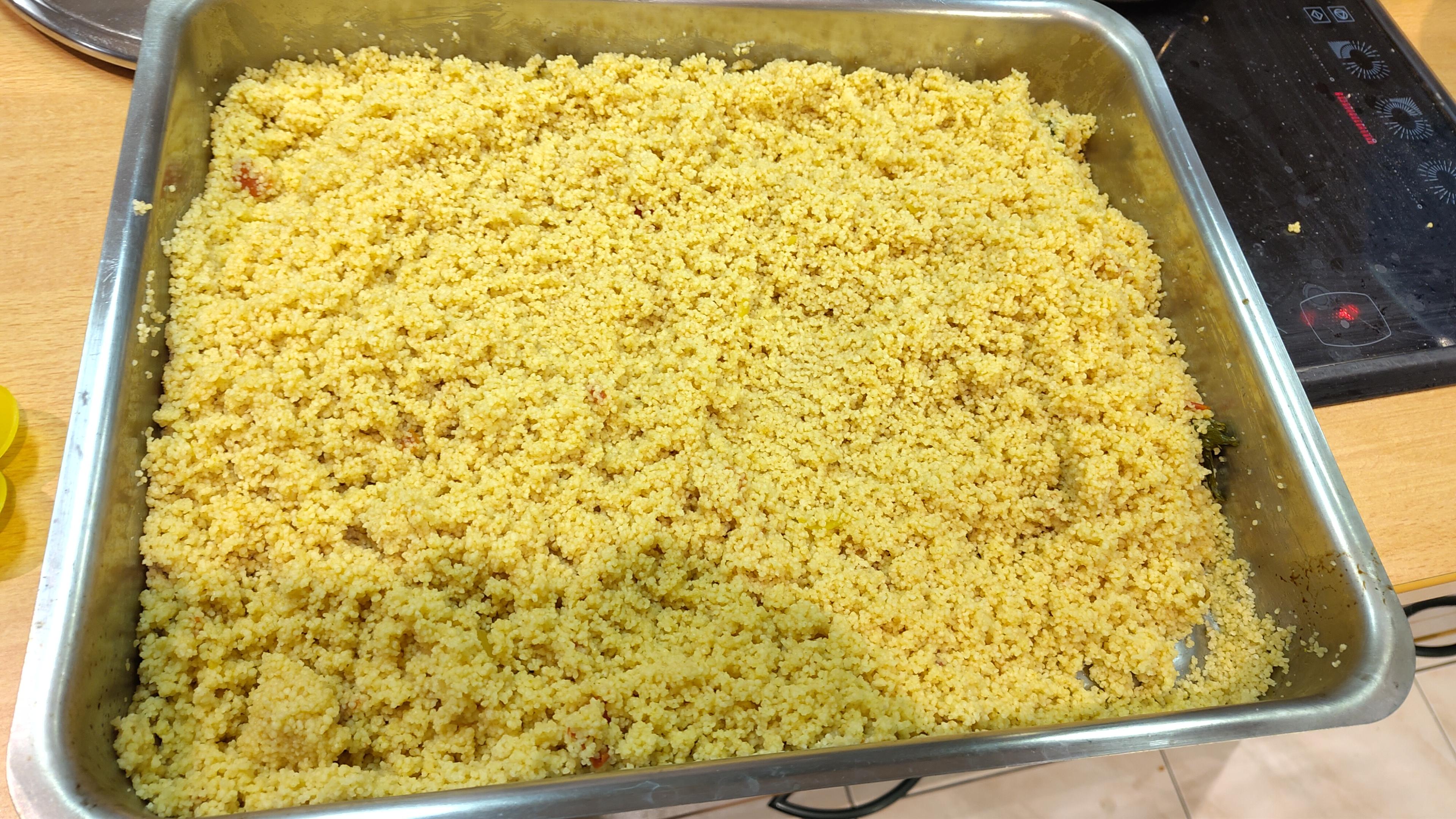 Méthode flemme : j'arrose ma semoule de bouillon (7 ou 8 louches), je remue bien (attention à ne pas noyer la semoule), puis je mets le plat au four à 50°C pour assécher un peu. Si ça semble devenir trop sec, il faut remouiller un peu.