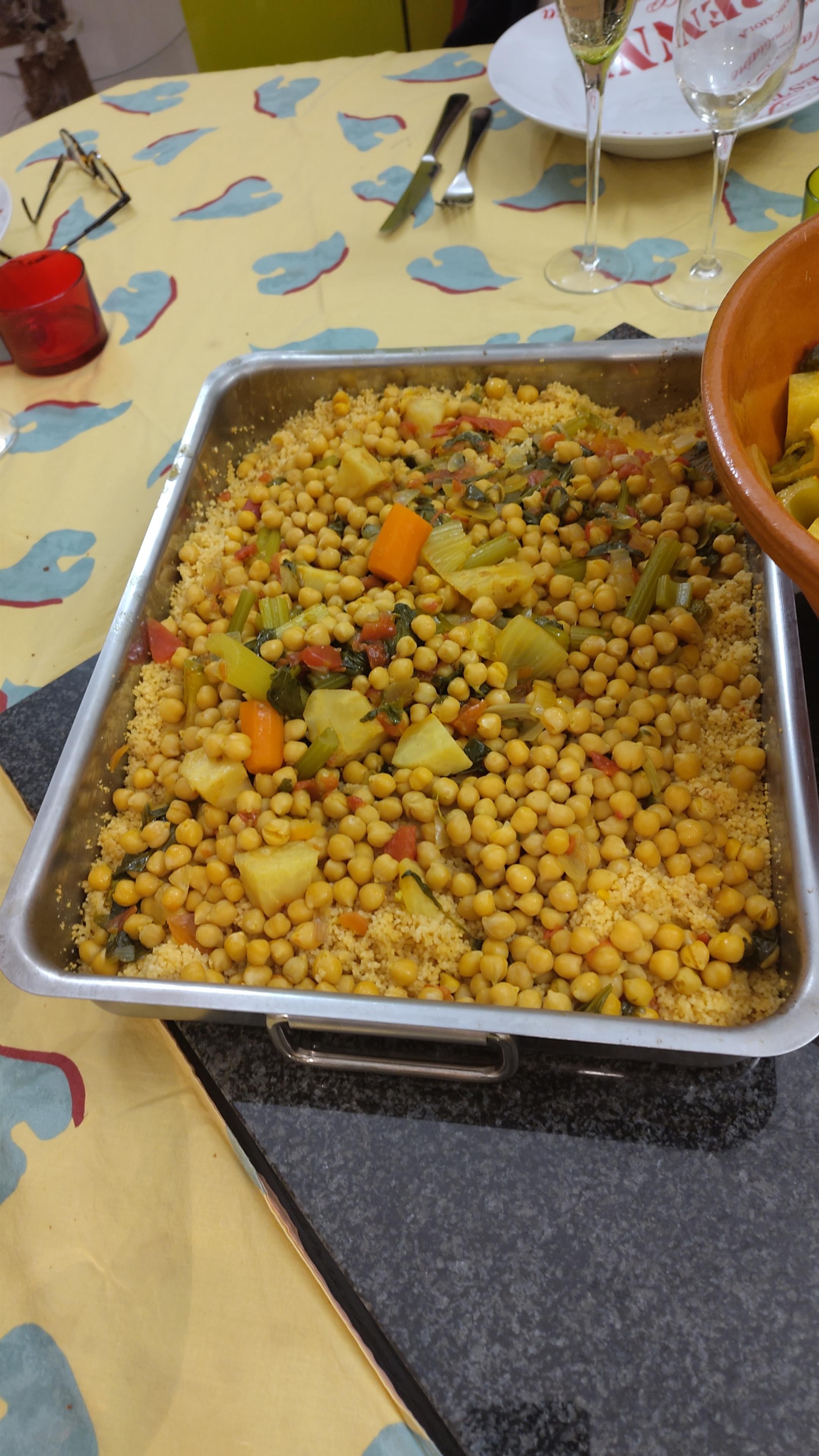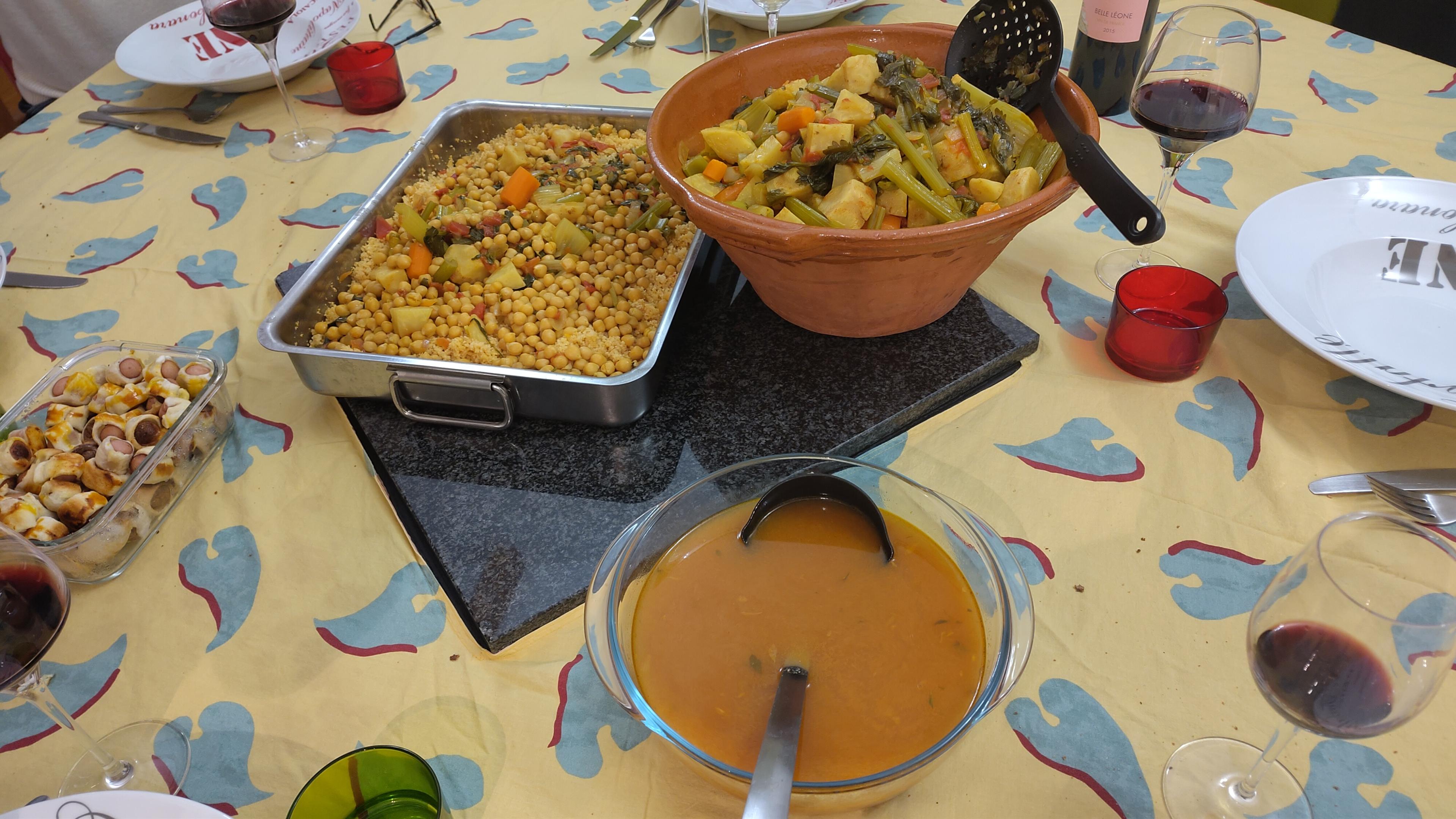 Les 3 plats sur la table : - un grand plat de semoule - un gros bol de légumes - un bol de sauce