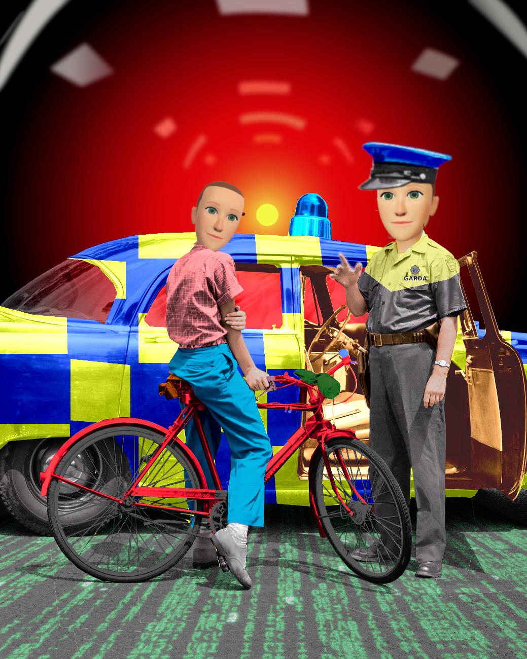 A 1950s image of a cop with a patrol car lecturing a boy on a bicycle. Both the cop's head and the boy's head have been replaced with the head of Mark Zuckerberg's metaverse avatar. The ground has been replaced with a 'code waterfall' effect as seen in the Wachowskis' 'Matrix' movies. The background has been replaced with the glaring red eye of HAL 9000 from Stanley Kubrick's '2001: A Space Odyssey.' The cop's uniform and car have been decorated to resemble the livery of the Irish Garda (police) and a Garda logo has been placed over the right breast of the cop's uniform shirt.
