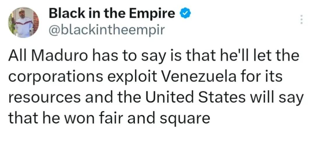 A screenshot of a post on Twitter by the user “Black in the Empire” reading “All Maduro has to say is that he'll let the corporations exploit Venezuela for its resources and the United States will say that he won fair and square”