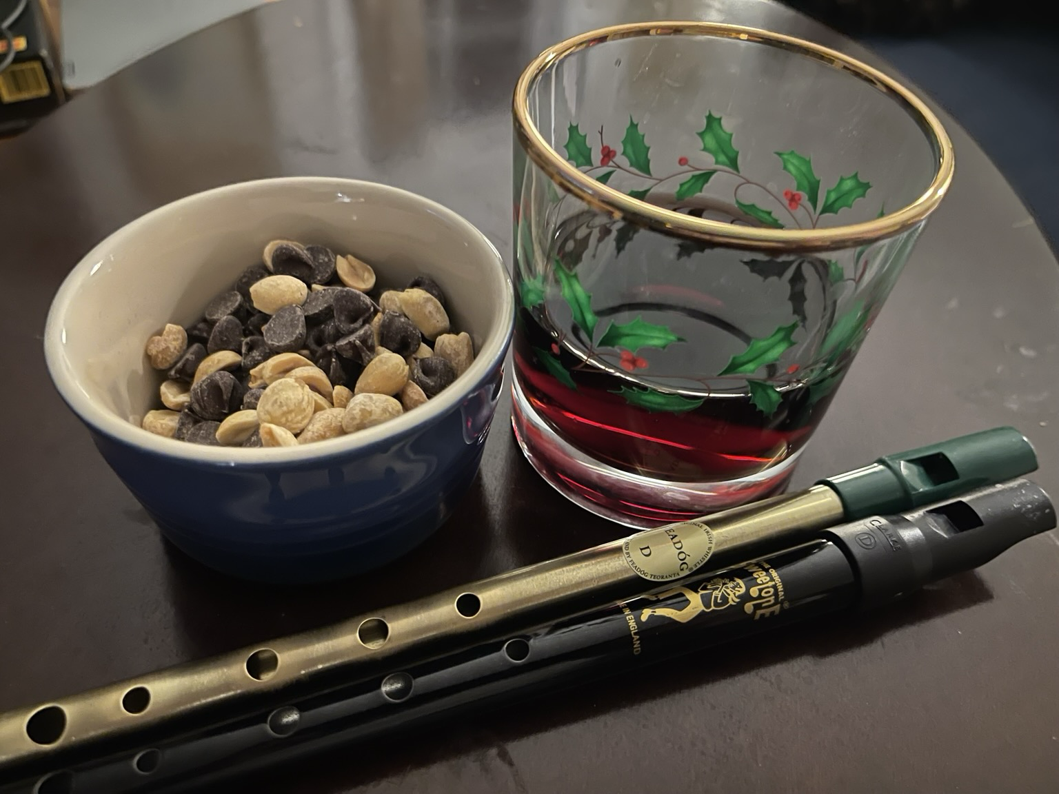 Two tin whistles, one brass and one black, lay in front of a glass of tawny port poured into a festive glass cup with a rim of gold alongside a ramekin filled with roasted peanuts and chocolate chips.