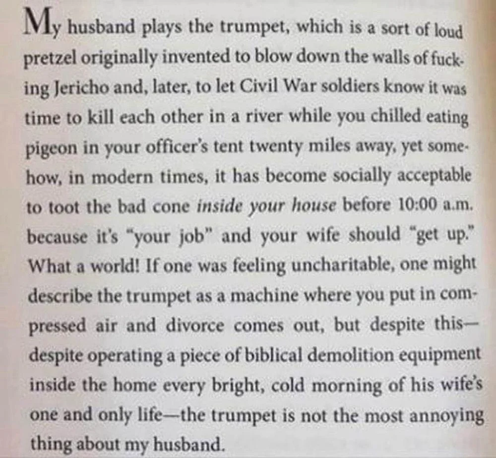 Picture of a page from the book. Text reads: "My husband plays the trumpet, which is a sort of loud pretzel originally invented to blow down the walls of fuck-ing Jericho and later, to let Civil War soldiers know it was time to kill each other in a river while you chilled eating pigeon in your officer's tent twenty miles away, yet some-how, in modern times, it has become socially acceptable to toot the had cone inside your house before 10:00 a.m. because it's your job" and your wife should "get up" What a world! If one was feeling uncharitable, one might describe the trumpet as a machine where you put in com-pressed air and divorce comes out, but despite this—despite operating a piece of biblical demolition equipment inside the home every bright, cold morning of his wife's one and only life—the trumpet is not the most annoying thing about my husband."