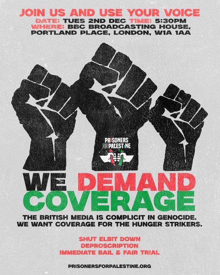 6 of the 32 political prisoners for #Palestine in the UK are on HUNGER STRIKE - now in its fourth week. This is the largest hunger strike since 1981, yet the mainstream media says nothing.