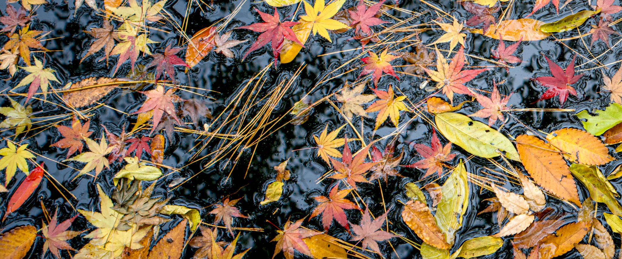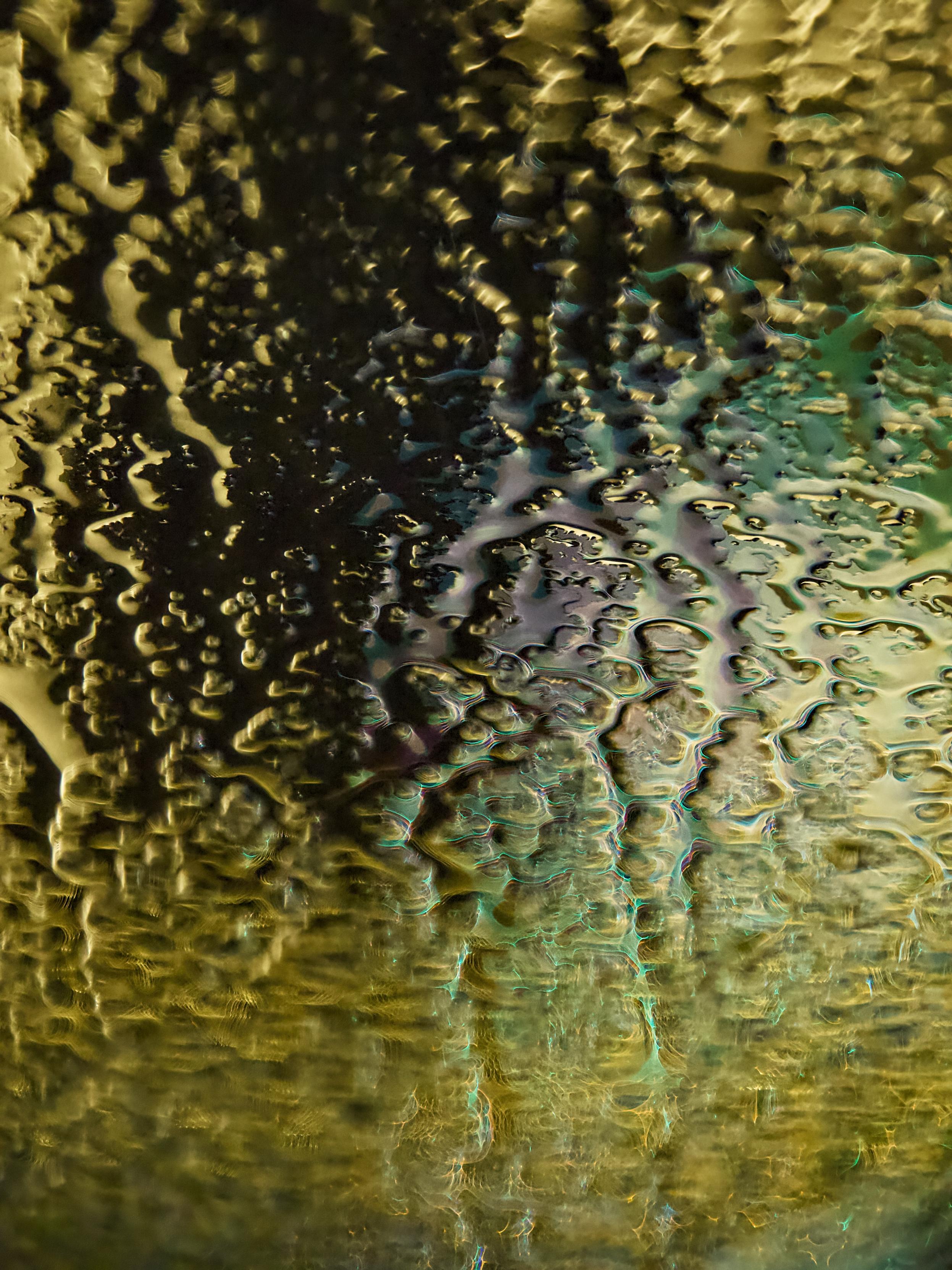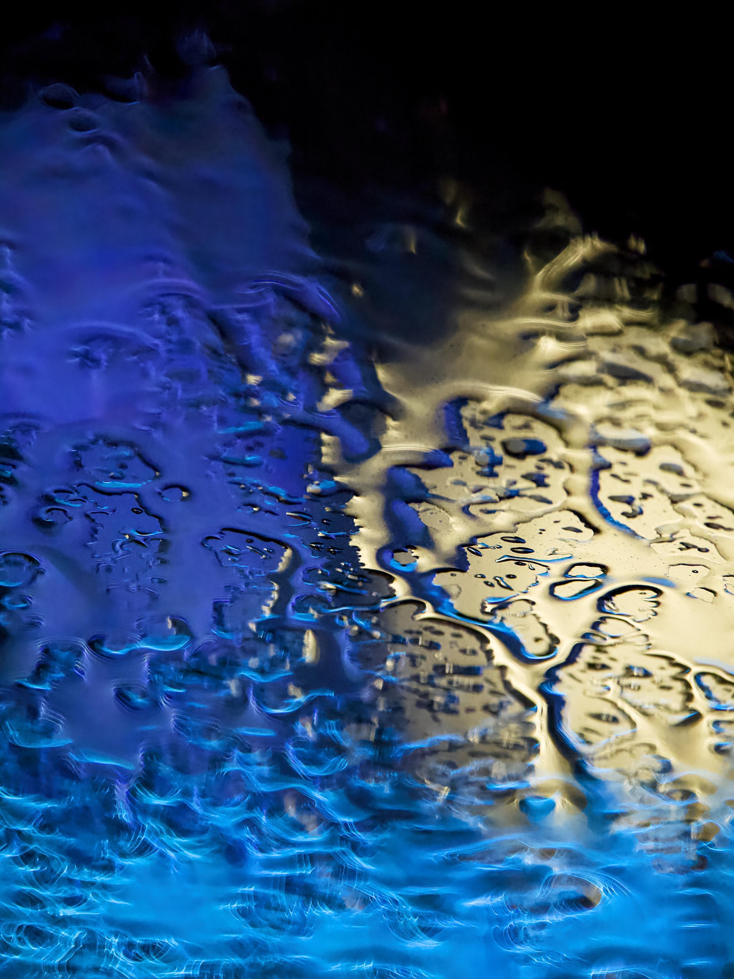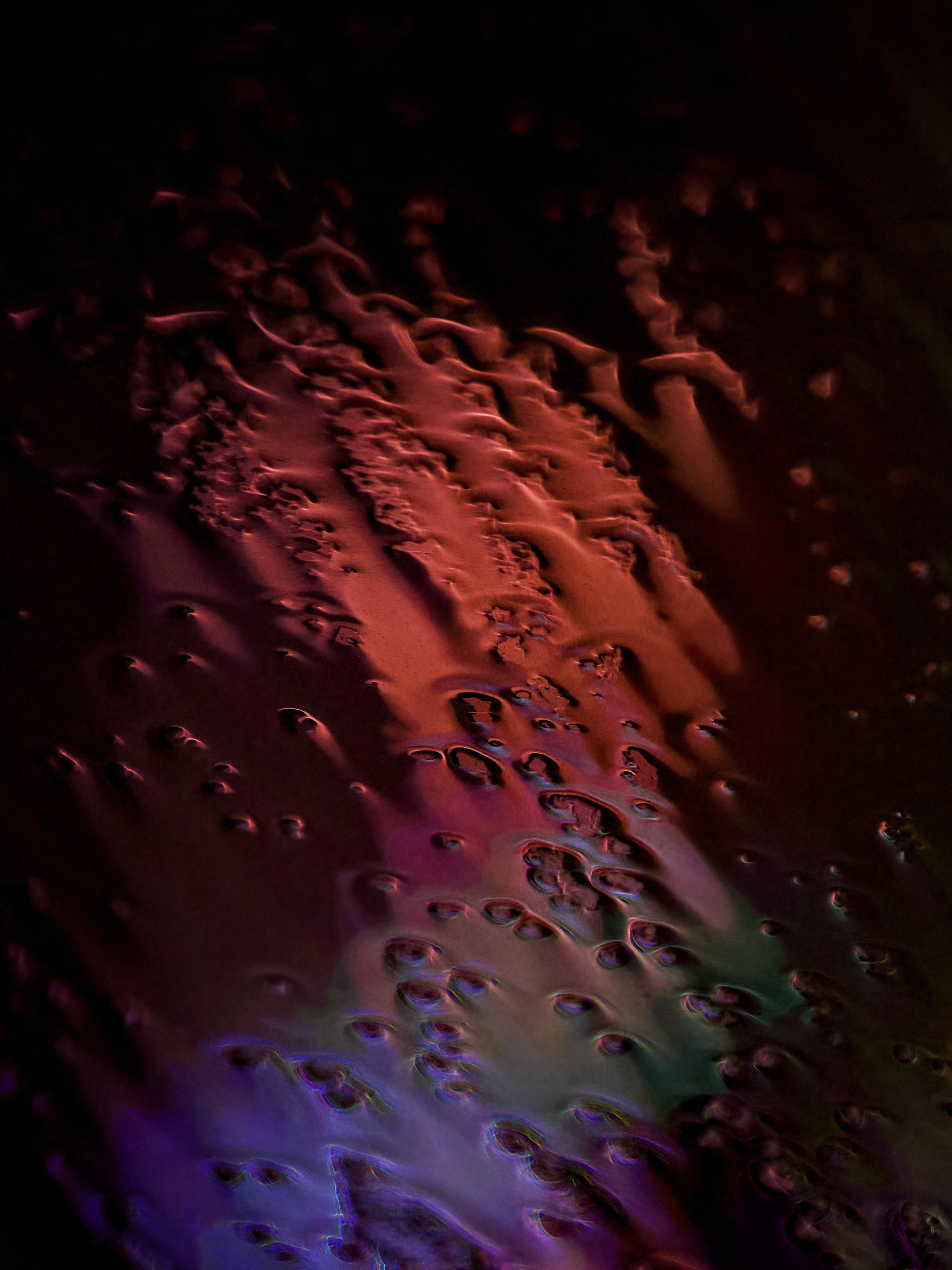 Rainwater patterns on glass, backlit by multi-coloured lights.