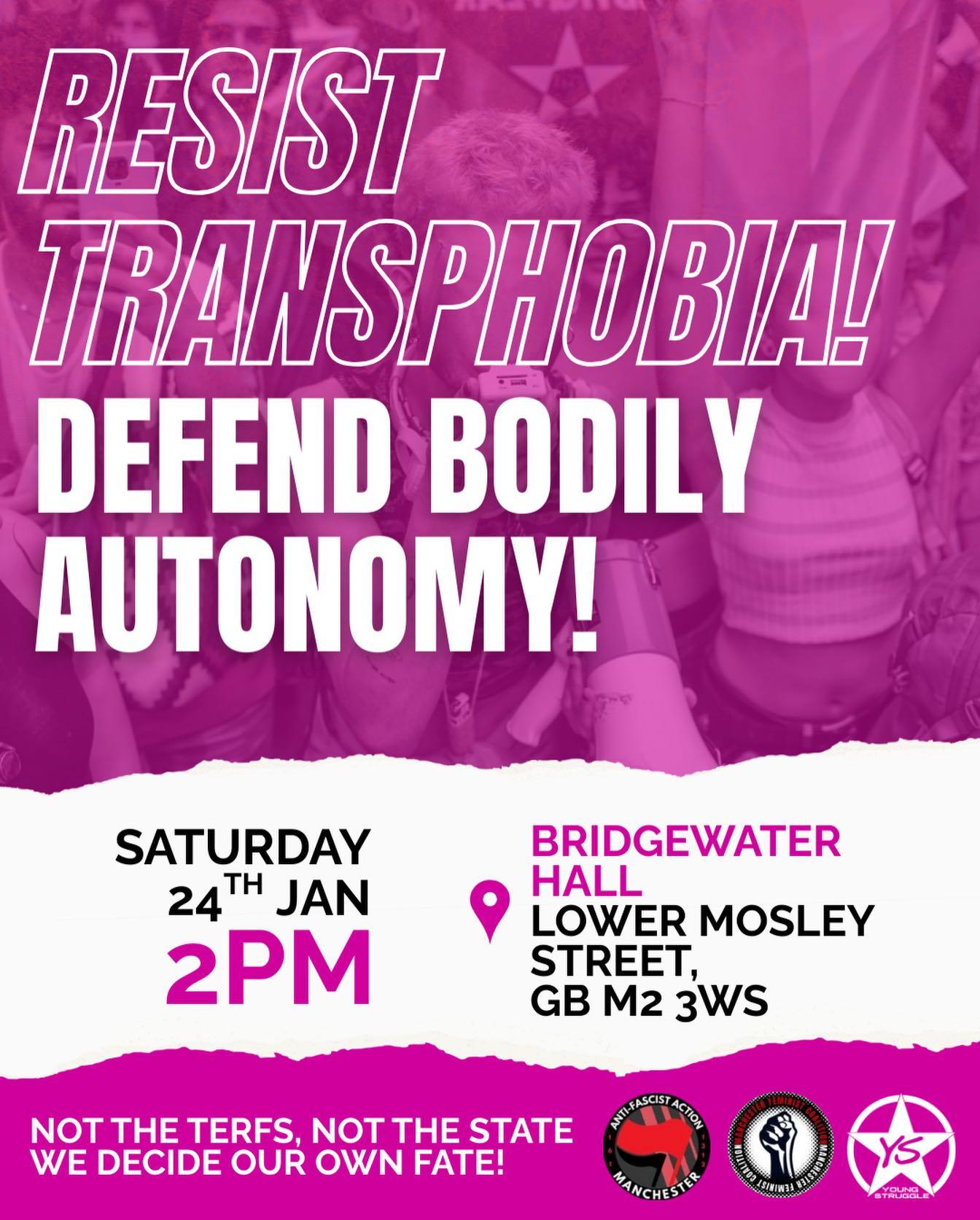 Join us in Manchester outside Bridgewater Hall, M2 3WS, at 2pm to assemble our bloc to confront the transphobes and fascists."