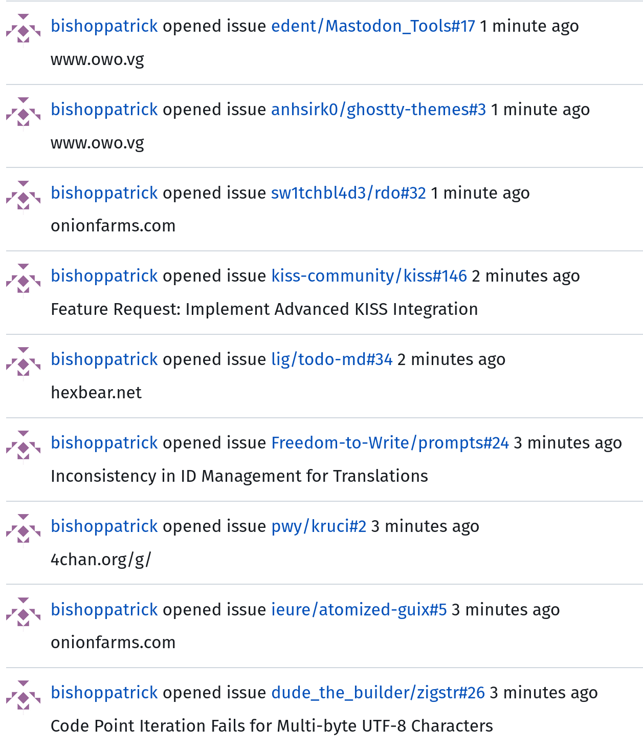 Bunch of AI generated issues which look superficially legitimate, interspersed with spamming random crap.