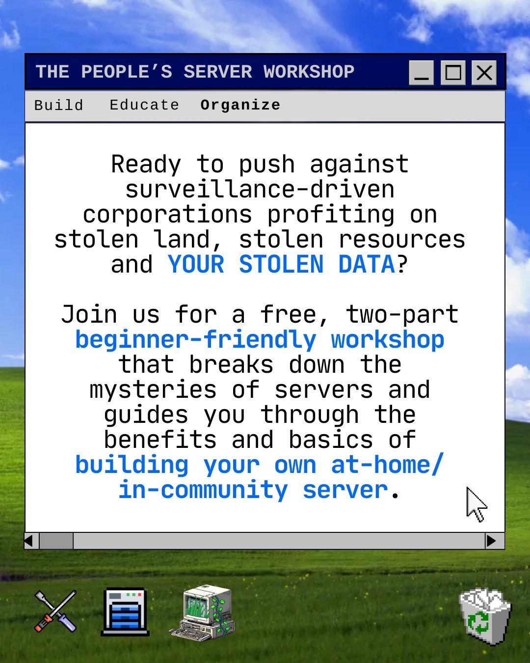 Join @scienceforthepeople and @ResearchForTheFrontLines for a free, two-part beginner-friendly workshop that breaks down the mysteries of servers and guides you through the benefits and basics of building your own at-home/in-community server. 🛠️👩🏻💻