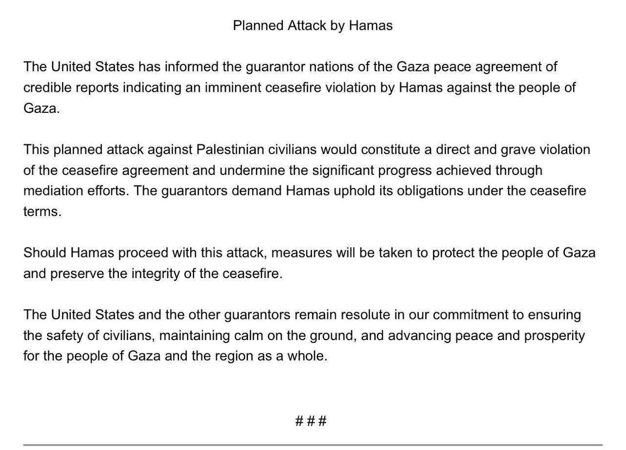 (ocr text) Planned Attack by Hamas The United States has informed the guarantor nations of the Gaza peace agreement of credible reports indicating an imminent ceasefire violation by Hamas against the people of Gaza. This planned attack against Palestinian civilians would constitute a direct and grave violation of the ceasefire agreement and undermine the significant progress achieved through mediation efforts. The guarantors demand Hamas uphold its obligations under the ceasefire terms. Should Hamas proceed with this attack, measures will be taken to protect the people of Gaza and preserve the integrity of the ceasefire. The United States and the other guarantors remain resolute in our commitment to ensuring the safety of civilians, maintaining calm on the ground, and advancing peace and prosperity for the people of Gaza and the region as a whole.