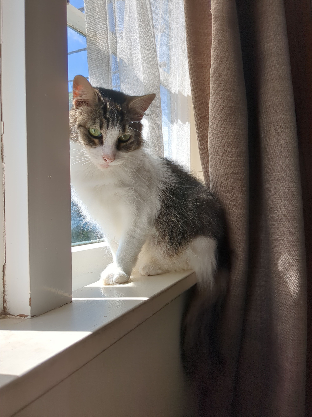 She's fully vaccinated, desexed, chipped, litterbox trained, and kind to soft furnishings. She'd suit a quiet household (no dogs or small kids), perhaps especially someone who's out a lot but doesn't want a pet who'll get distressed being on their own. Salix is comfortable with her own company but will also welcome yours (especially if you have food).